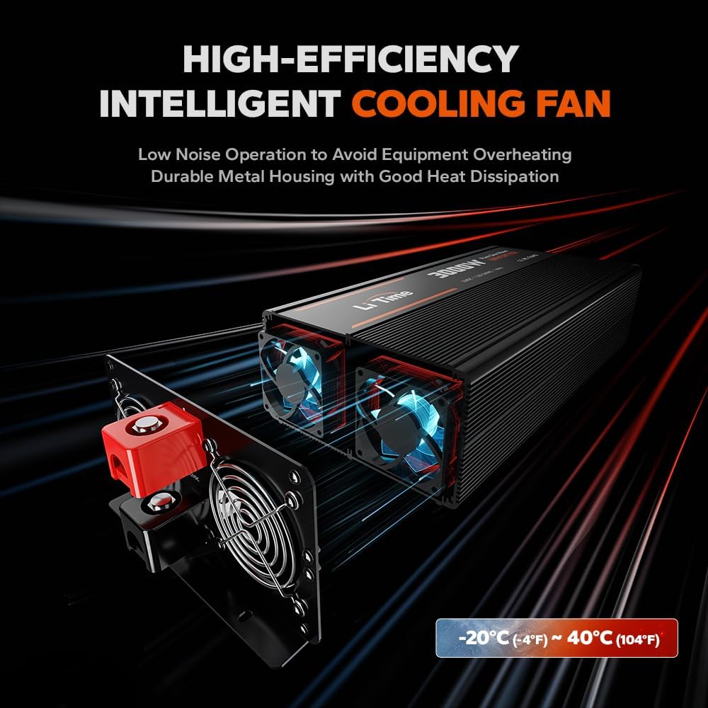 - All-round Safety Protections: The LiTime Inverter ensures all-around safety with over-voltage, low-voltage, overheat, overload, and short-circuit protections, safeguarding both your devices and the system. Its high-efficiency dual cooling fans intelligently regulate temperature, enabling smooth performance even in extreme environments (-20โ to 40โ).