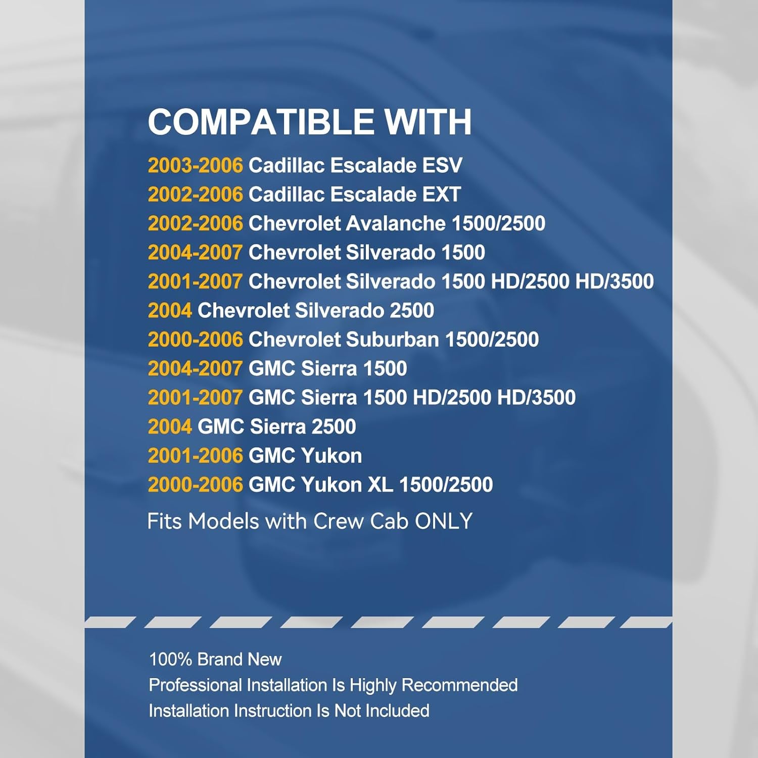 - Vehicle Compatibility - Window Visors Compatible with Chevy Silverado/GMC Sierra 1500 2500 HD 3500 Classic Crew Cab 01-07, Chevy Avalanche 1500 2500 Crew Cab 02-06, GMC Yukon XL 01-06, Chevy Suburban 1500 2500 00-06,Fits Models with Crew Cab ONLY.