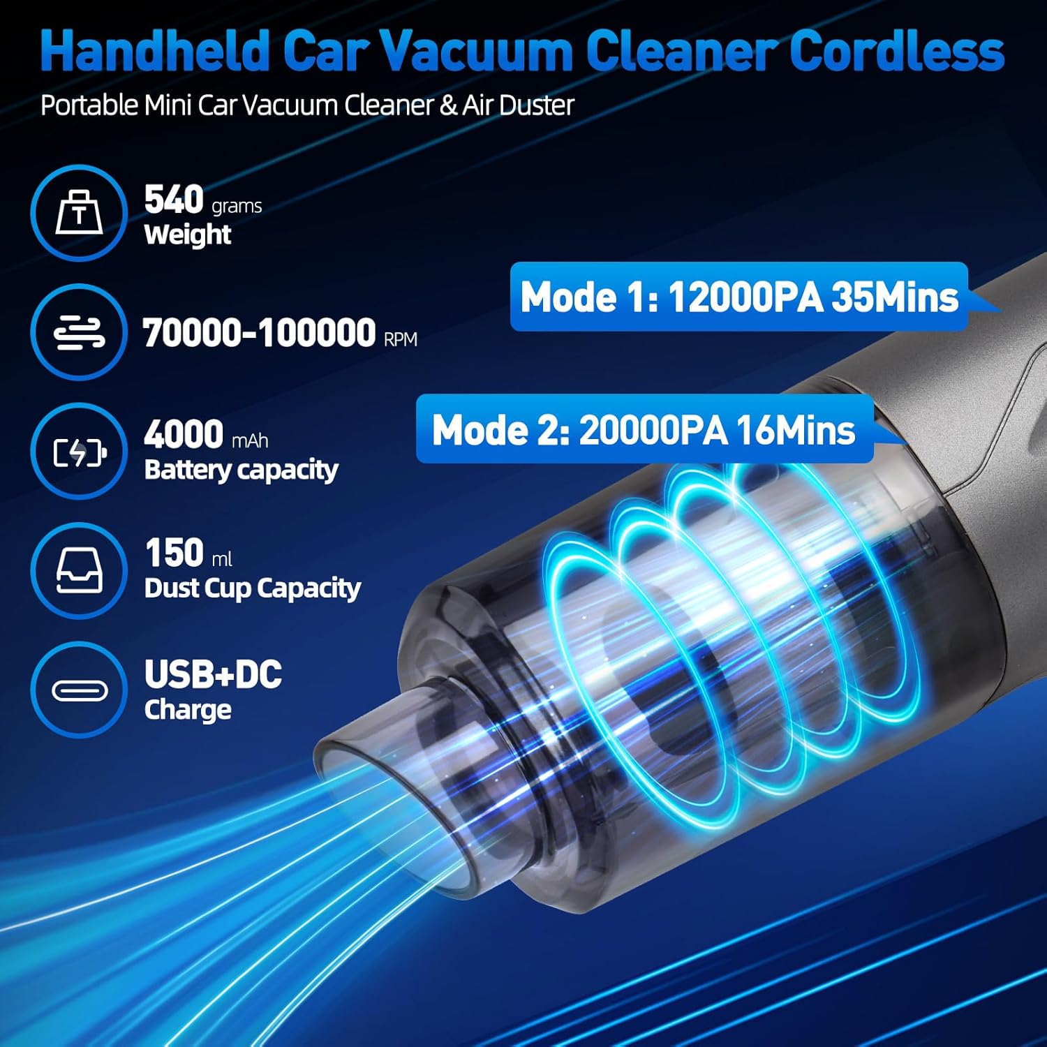 - 【Suction & Blow 4 in 1】 Our handheld car vacuum cleaner offers versatile functionality, combining suction, blowing, charging, and vacuuming. With powerful 20,000PA suction, it's perfect for cleaning your car and home. Easily remove debris from stubborn crevices, windows, and desktops, and use it to clean keyboards or inflate items. This multi-use tool covers all your cleaning needs.
