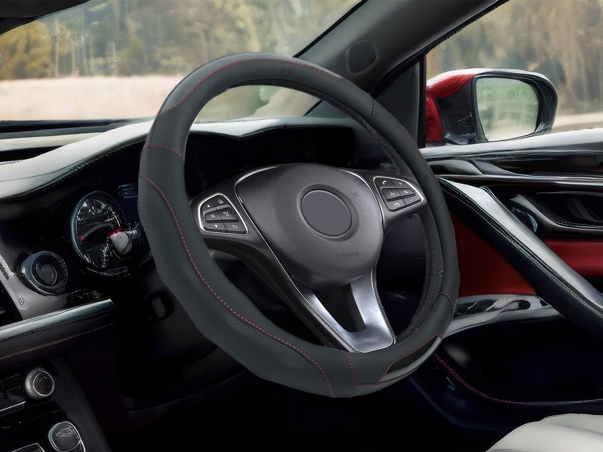 - Stylish Comfort Design: Elegant and classic steering wheel cover with 2 car coasters to dress up your car and make it less monotonous. The stylish leather and carbon fiber splicing, comfort grip design is beautiful and classy, showing details everywhere