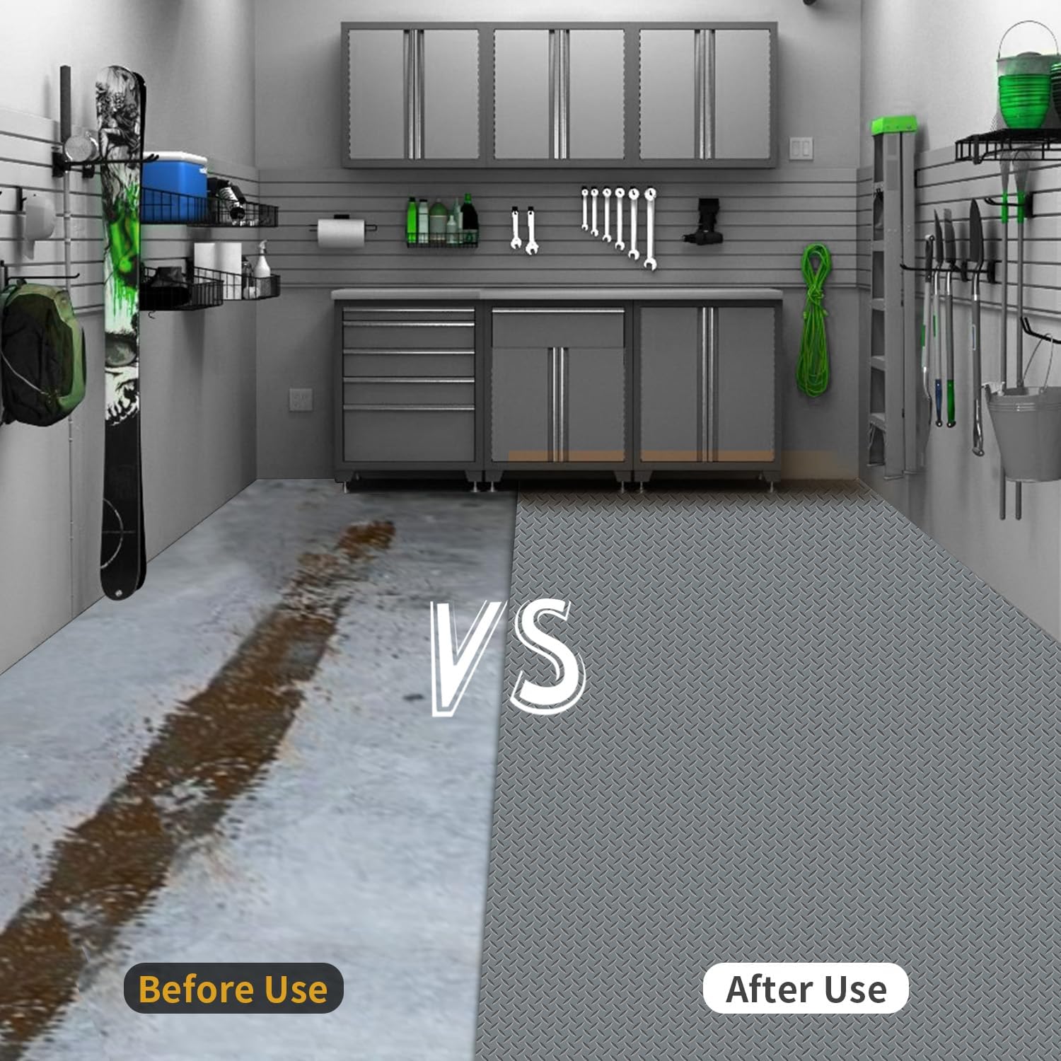 - DURABLE & SLIP-RESISTANT: Upgrade 2.0MM Sturdy Thicker PVC Material. Garage floor mats are with embossed diamond plate patterns which are totally anti-slip for safe in/out, greatly increasing the traction.