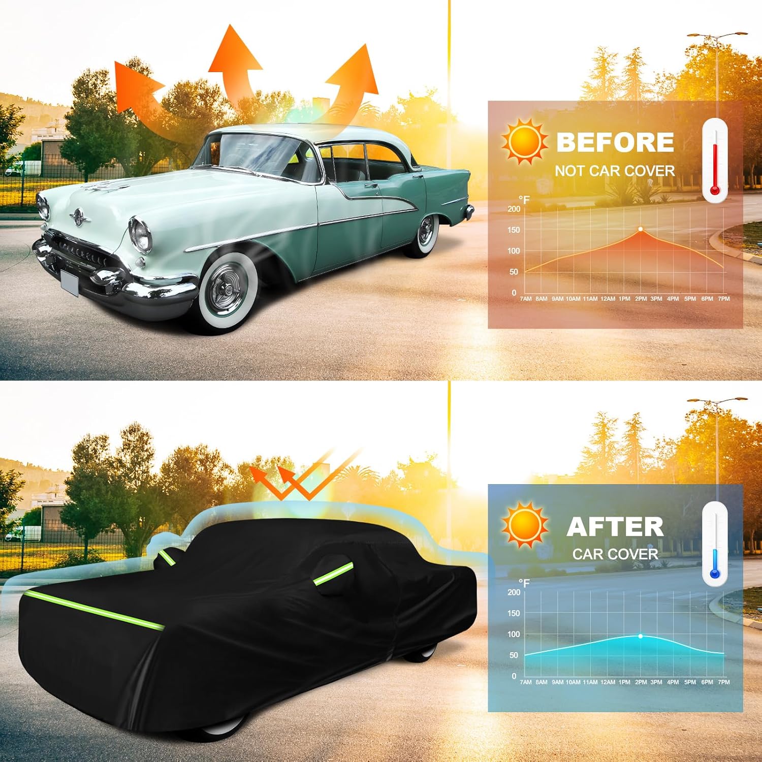 - 【Designs of Car Cover】(1) Black Coating: UV protection and heat-proof,prevent cracking and aging of inner decoration leather and plastic. (2)5 Reflective Strips attached on the front DRL lamps, middle Turning lights and Rear taillight to prevent collisions during the night.(3)Mirror Pocket: All-around protection of the rearview mirror.(4) The cab side has a zipper for temporary access.