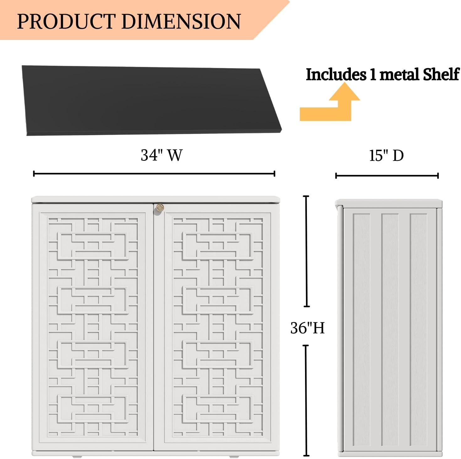 - Optimal Space Utilization: This size of patio storage cabinet is 34"L*15"W*36"H in about 60 gallon storage capacity, can widely used indoors and outdoors. providing a convenient way to store bedroom shoes, towels, personal collections, utility room items, and outdoor supplies.