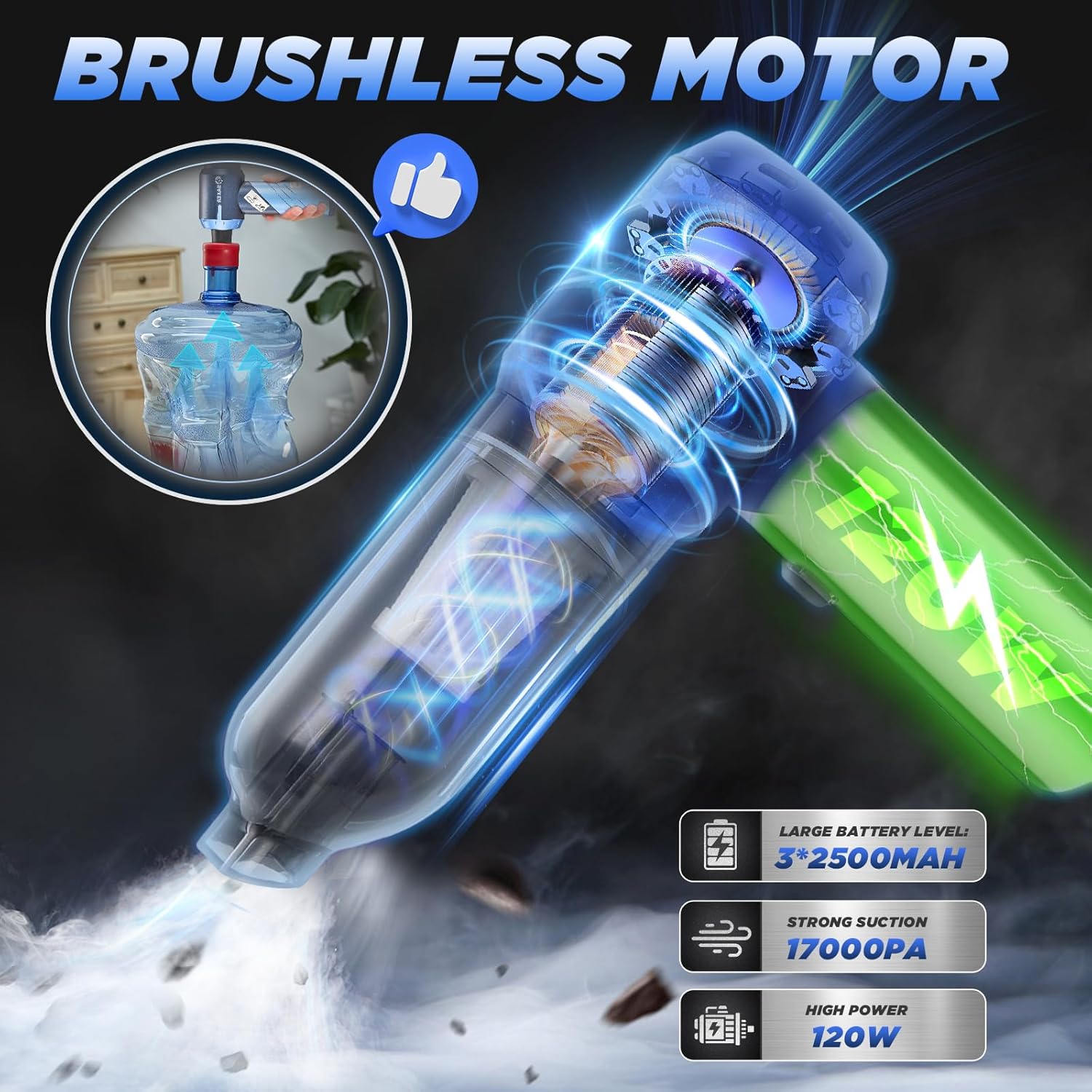 - ă17000 PA Super Suction ă The car vacuum cleaner high power can achieve three levels of suction adjustment, thanks to its upgraded high-speed brushless motor, which increases the suction to 17000PA. Whether it is a large area or a small area, dust and debris can be easily cleaned.