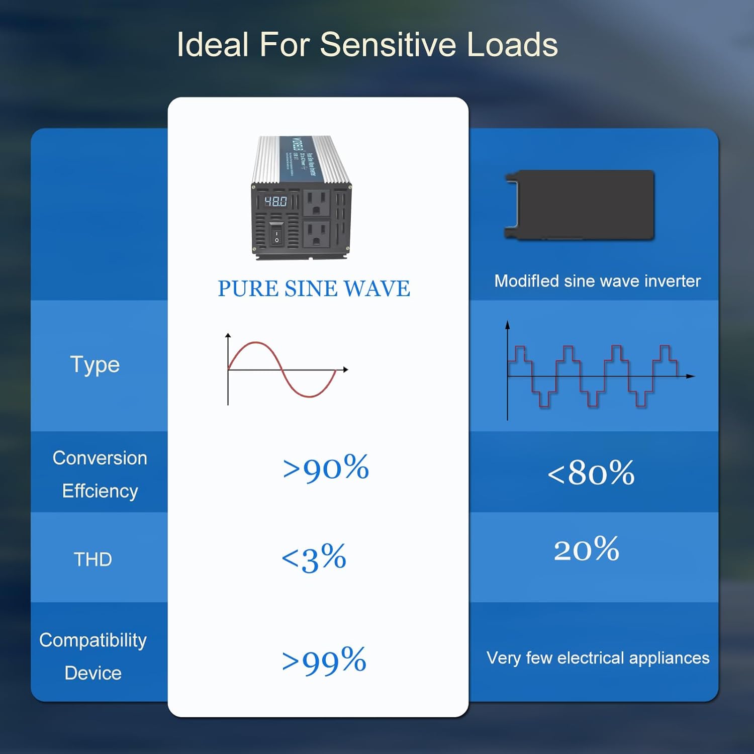- 【Pure Sine Wave Power Inverter】High quality pure copper inductance, filter the wave form; imported mosfets with strong driving capacity, 1000 watt stable true pure sine wave AC output,2000W peak ,60Hz ,high frequency, with 2*120VAC outlets,8.33Amp Max, converts 48V DC to 110V 120V AC with FULL POWER OUT, suitable for the sensitive appliances.