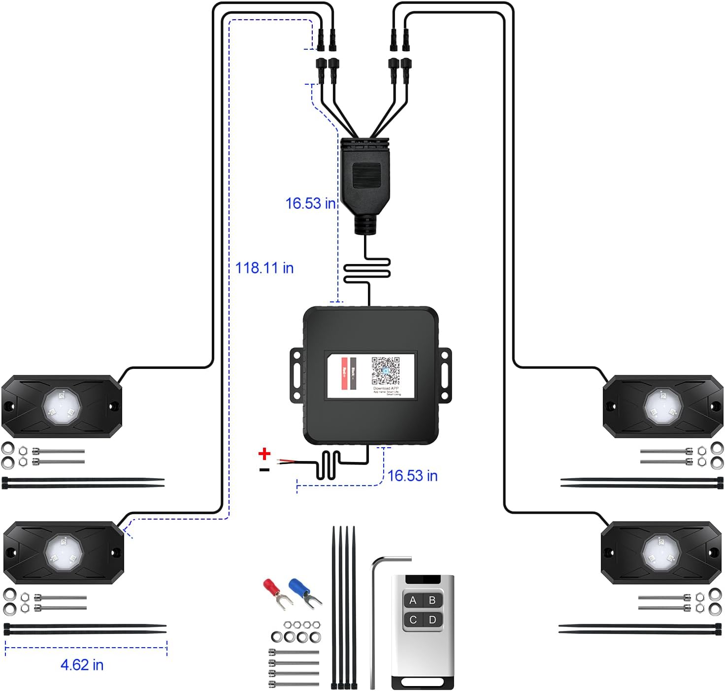 - Included Components : LED Rock Lights, Control Box, Remote, Heat Shrink Wire Connectors, Fuse Holder, Blade Fuse, Zip Ties, Screws, Allen Wrench LED Rock Lights, Control Box, Remote, Heat Shrink Wire Connectors, Fuse Holder, Blade Fuse, Zip Ties, Screws, Allen Wrench