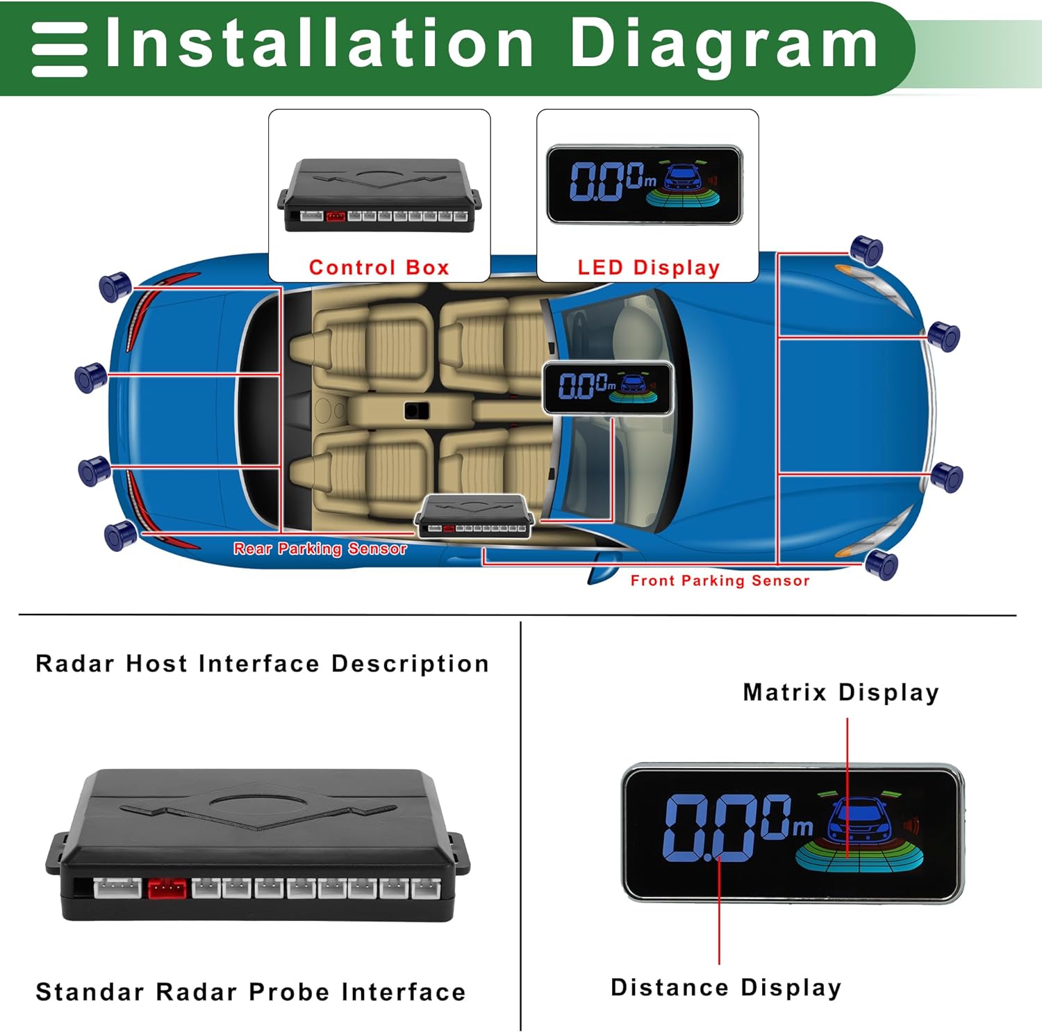 - What You Get:This parking sensor system includes 8 Parking Sensors, a control box, and a LED display screen.