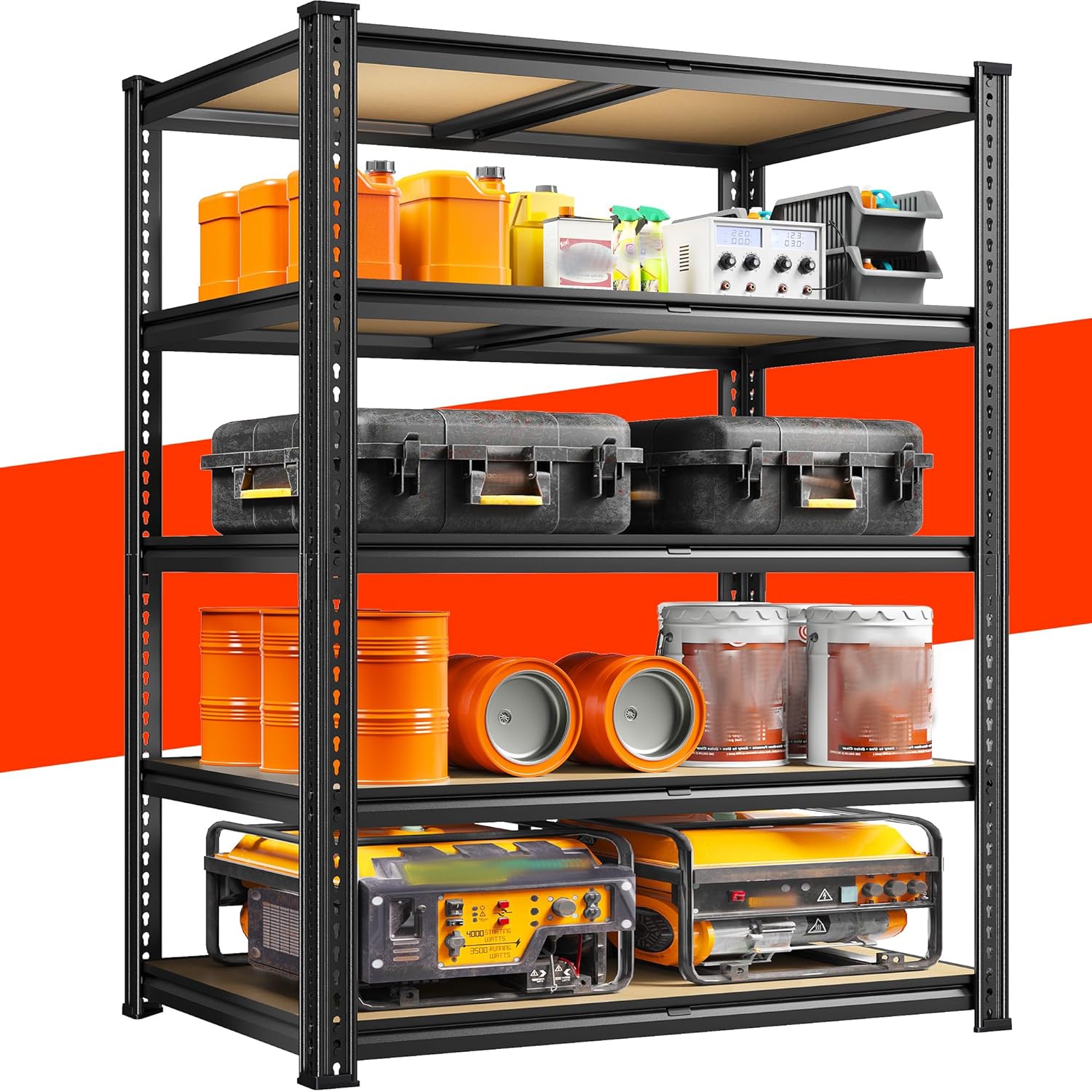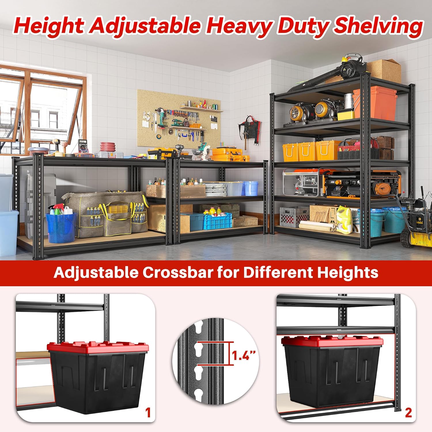 - ă2300LBS Strong Storage ShelvesăThis garage shelving is strong enough to handle garage and tool shed storage. Manufactured from high-grade steel with rolled-edge craftsmanship. Perfect for garage, basement, warehouse, kitchen, shed organization