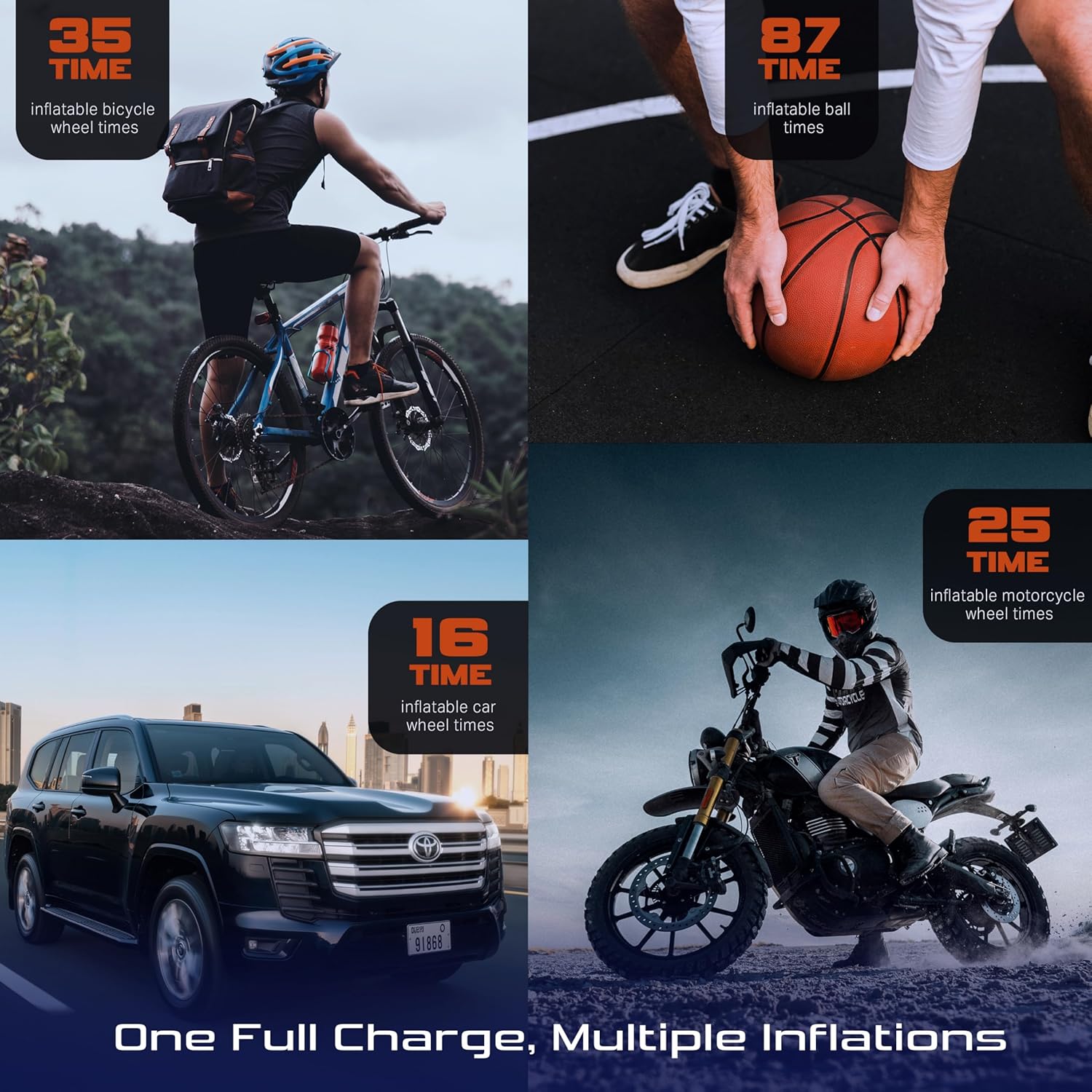 - Multiple Uses Beyond Car Tires โ In addition to car, truck, and motorcycle tires, this multi-functional air compressor can inflate sports balls, bicycles, pool inflatables, and more. The OQTER Tire Inflator is compatible with various inflatable products, making it a versatile tool for any outdoor activity or sports enthusiast.