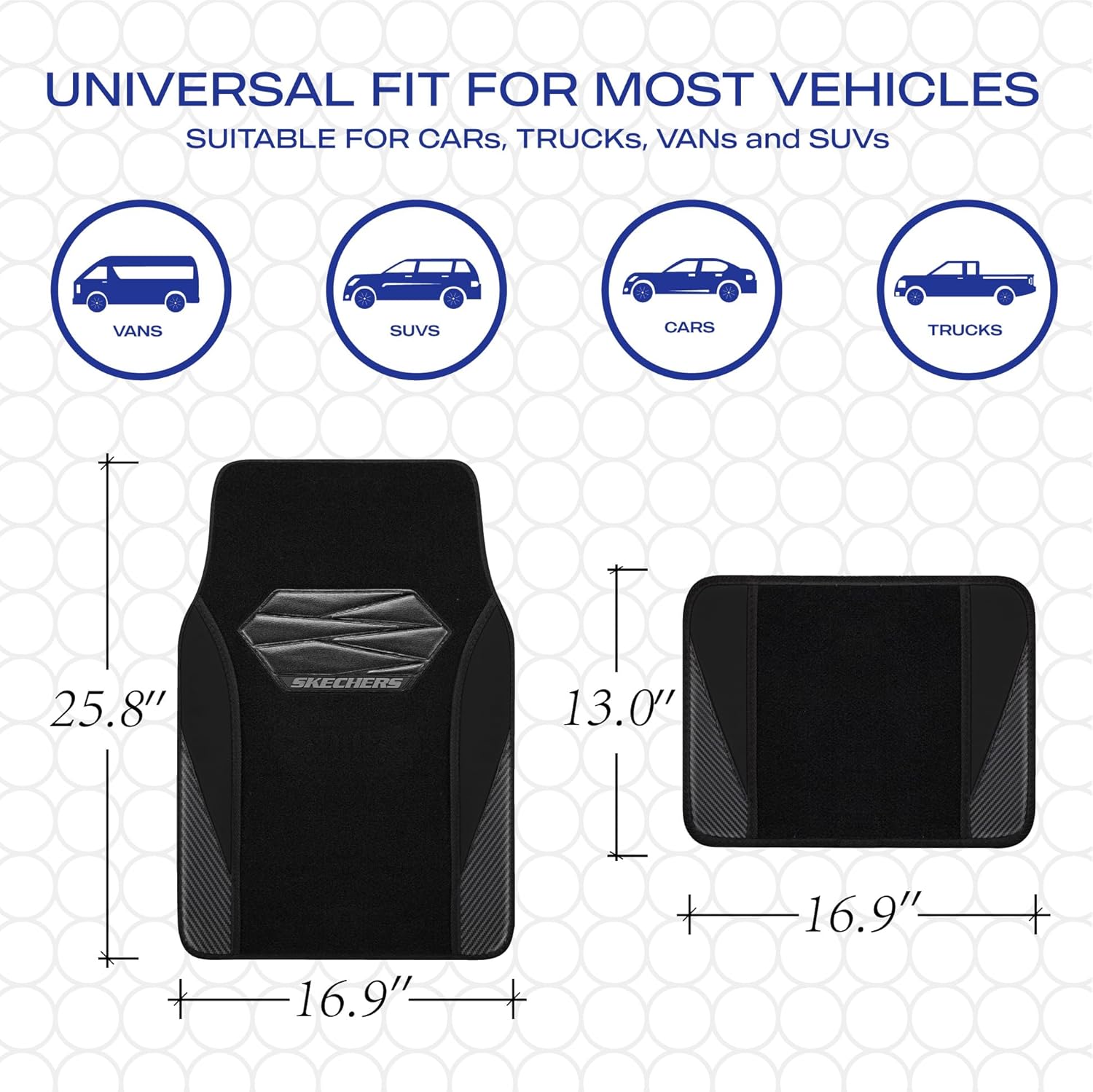 - UNIVERSAL FIT-Skechers car mats Designed to fit most SUVs,vans,sedans,and trucks, This full set includes 4 floor mats,Front piece: 25.8Γ16.9 inches,Back piece: 11.4Γ16.1 inches, providing comprehensive coverage for both front and rear seats, giving your entire vehicle floor the protection it needs.Perfect gift for family, relatives and friends