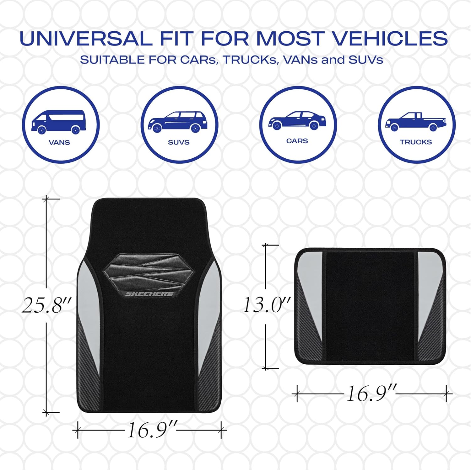 - UNIVERSAL FIT-Skechers car mats Designed to fit most SUVs,vans,sedans,and trucks, This full set includes 4 floor mats,Front piece: 25.8Γ16.9 inches,Back piece: 11.4Γ16.1 inches, providing comprehensive coverage for both front and rear seats, giving your entire vehicle floor the protection it needs.Perfect gift for family, relatives and friends