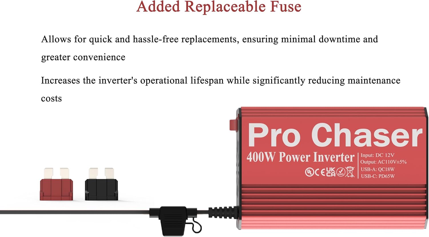 - 【Pro Chaser Power Inverter Basics】: Our inverter provides 400 watts of continuous DC to AC power and up to 800 watts of peak power. It includes two 110V AC outlets, a USB-A QC 18W port, and a USB-C PD 65W port, offering versatile charging options for multiple devices. For added convenience, it also features a replaceable in-line fuse.