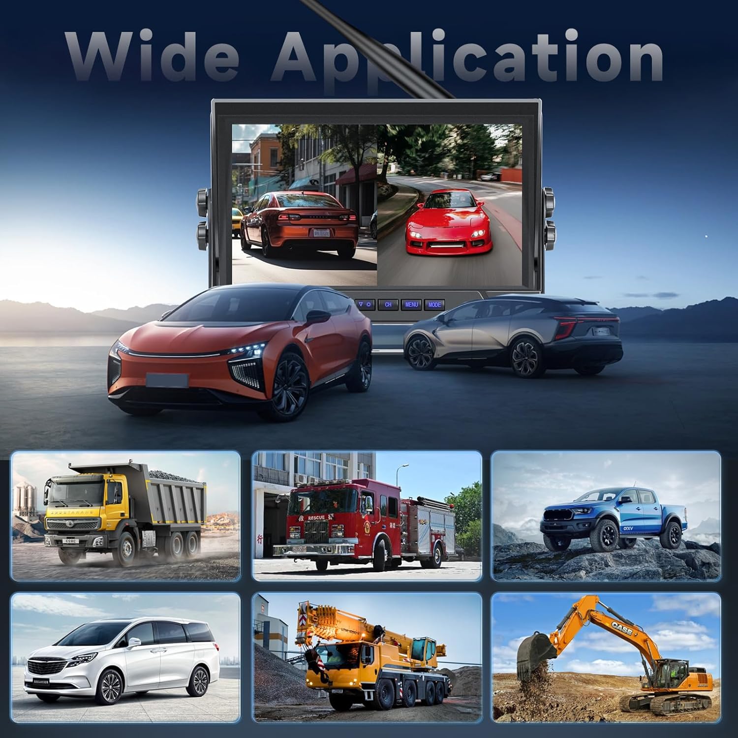 - 9-inch IPS Screen & Multifunctional View: 9-inch large screen backup camera monitor, wireless monitor supports up to four wireless cameras, you can choose the view mode of the display camera, full view single camera, split view dual camera, triple view, quad view, this system contains 2 cameras, two-way monitoring, comprehensive vehicle security