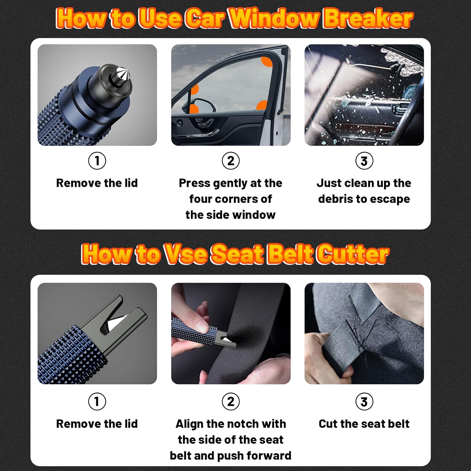 - Fashionable & Portable: This escape tool is only 4 inches, lightweight, and powerful. It is easy to carry and can be hung on your keychain or on your vehicle's center console using Velcro tape. You can buy two, one in the front row and one in the rear row.