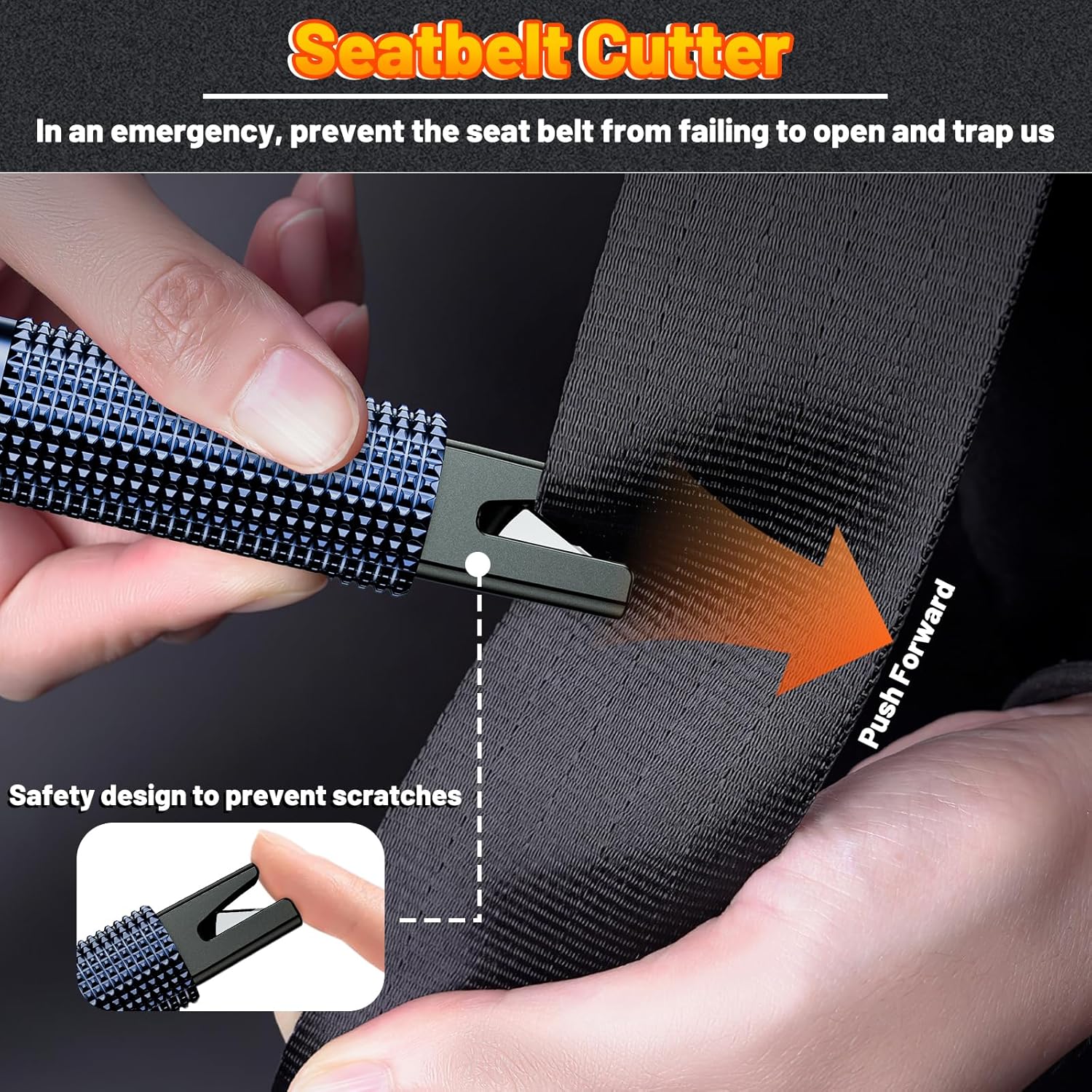 - Seat Belt Cutter: The seat belt cutter features a built-in stainless steel cutter with a U-shaped hidden knife edge design, ensuring safety and preventing hand injuries. Simply align the U-shaped mouth of the cutter with the seat belt, push it forward swiftly, and get out of the vehicle easily and quickly.