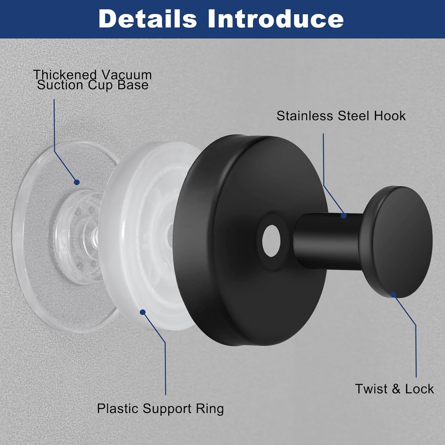 - 【Easy To Install】1. Choose and clean a smooth, non-porous surface. 2. Loosen the hook counter-clockwise, install the adhesive discs. 3. Press the base against the surface and twist the hook clockwise until fully tight(detailed steps can be viewed in the instructions)