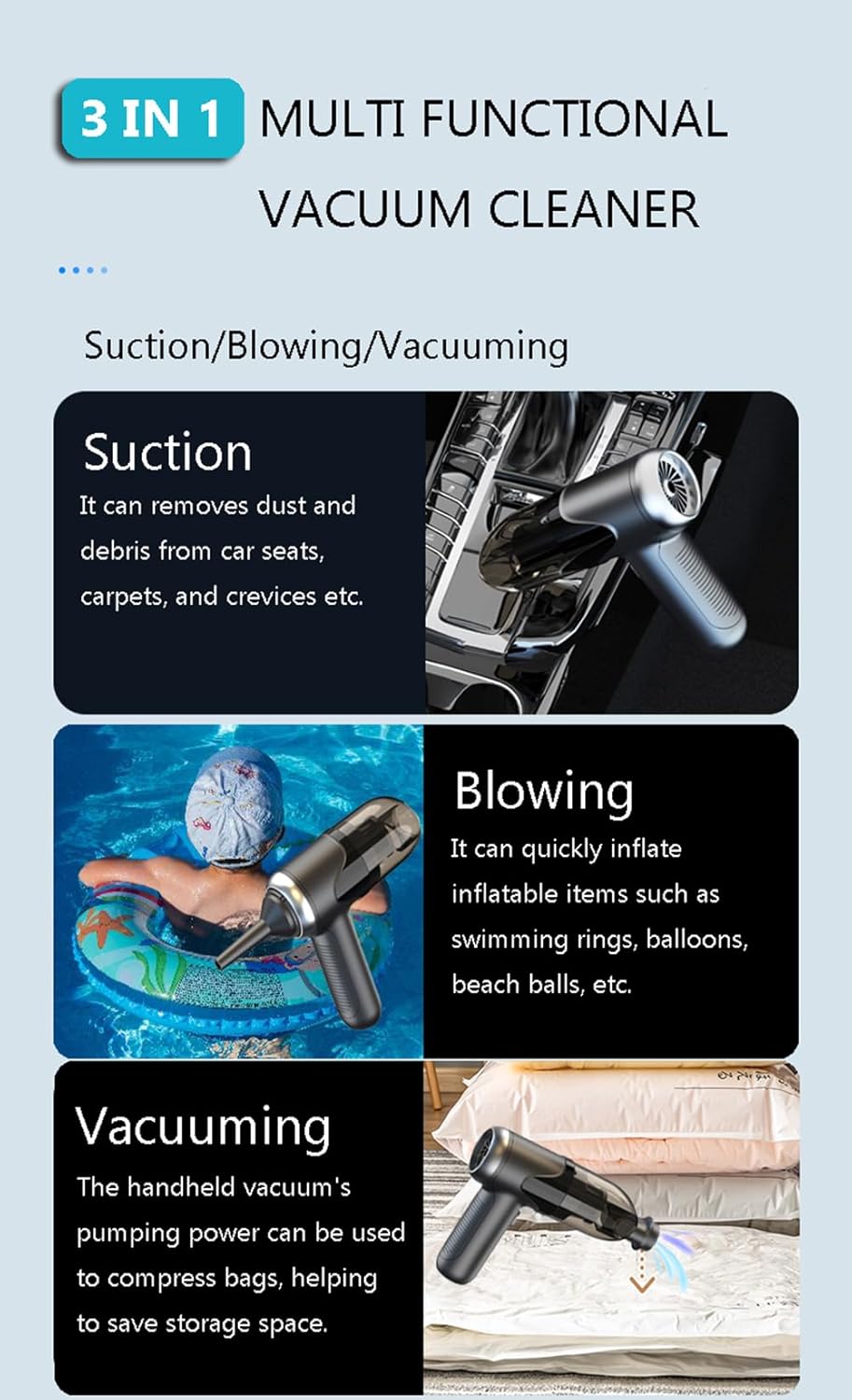 - ๐จ[3-IN-1 VACUUM CLEANER] This handheld vacuum cordless comes with 7 detachable accessories for blowing, vacuuming, and inflating, meeting all your daily cleaning needs. Its powerful suction effortlessly removes dust and debris from car seats, carpets, and crevices. The other end functions as a blower, easily clearing dust from keyboards, camera lenses, and windows, it can also inflate balloons and swim rings.