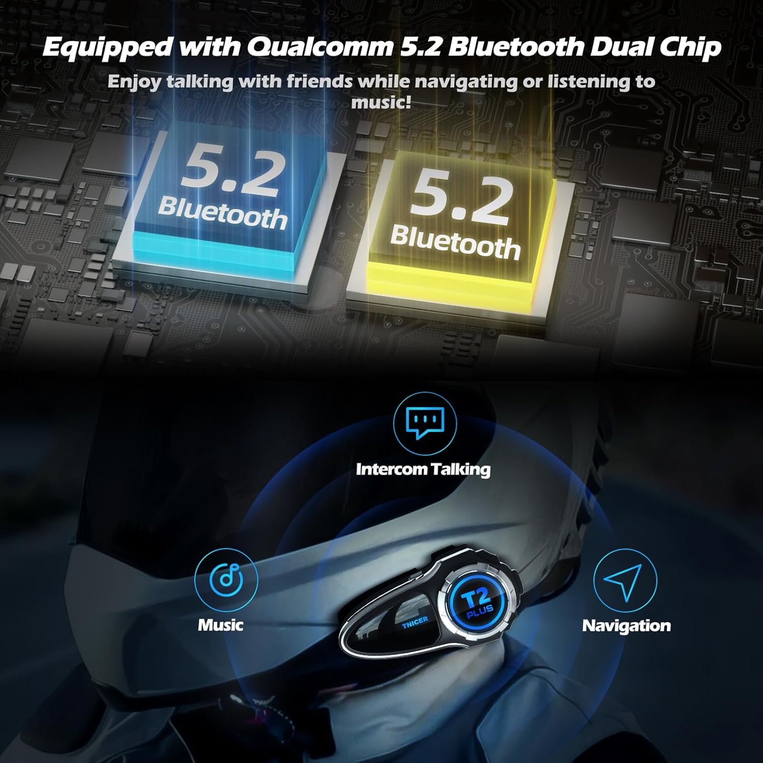 - 【Equipped with Excellent Bluetooth 5.2 Dual Chip】The T2Plus motorcycle intercom allows you to have intercom conversations while listening to music or navigating. Up to 8 riders can communicate in real-time within a range of 1500 meters, making communication with your companions much smoother. In pairing mode, you can connect all T2Plus devices with just one button press, freeing you from complicated setup processes.