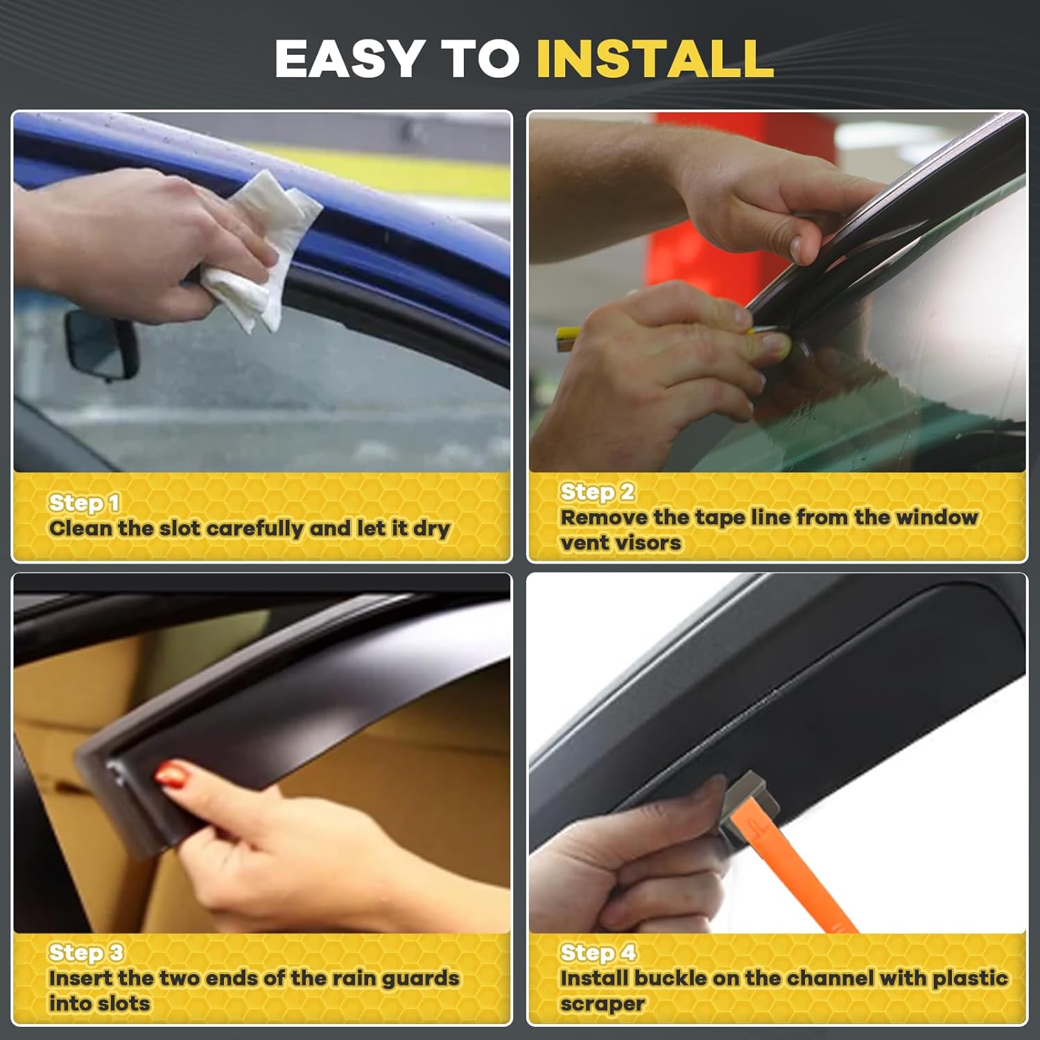 - ăIn Channel DesignăInstalled in the window channel, provides perfect fit and sleek look for your car. Come with 4 pcs side window deflectors, 8 pcs clips, 1 pcs plastic Crowbar for a durable and secure installation. No complicated instructions are needed