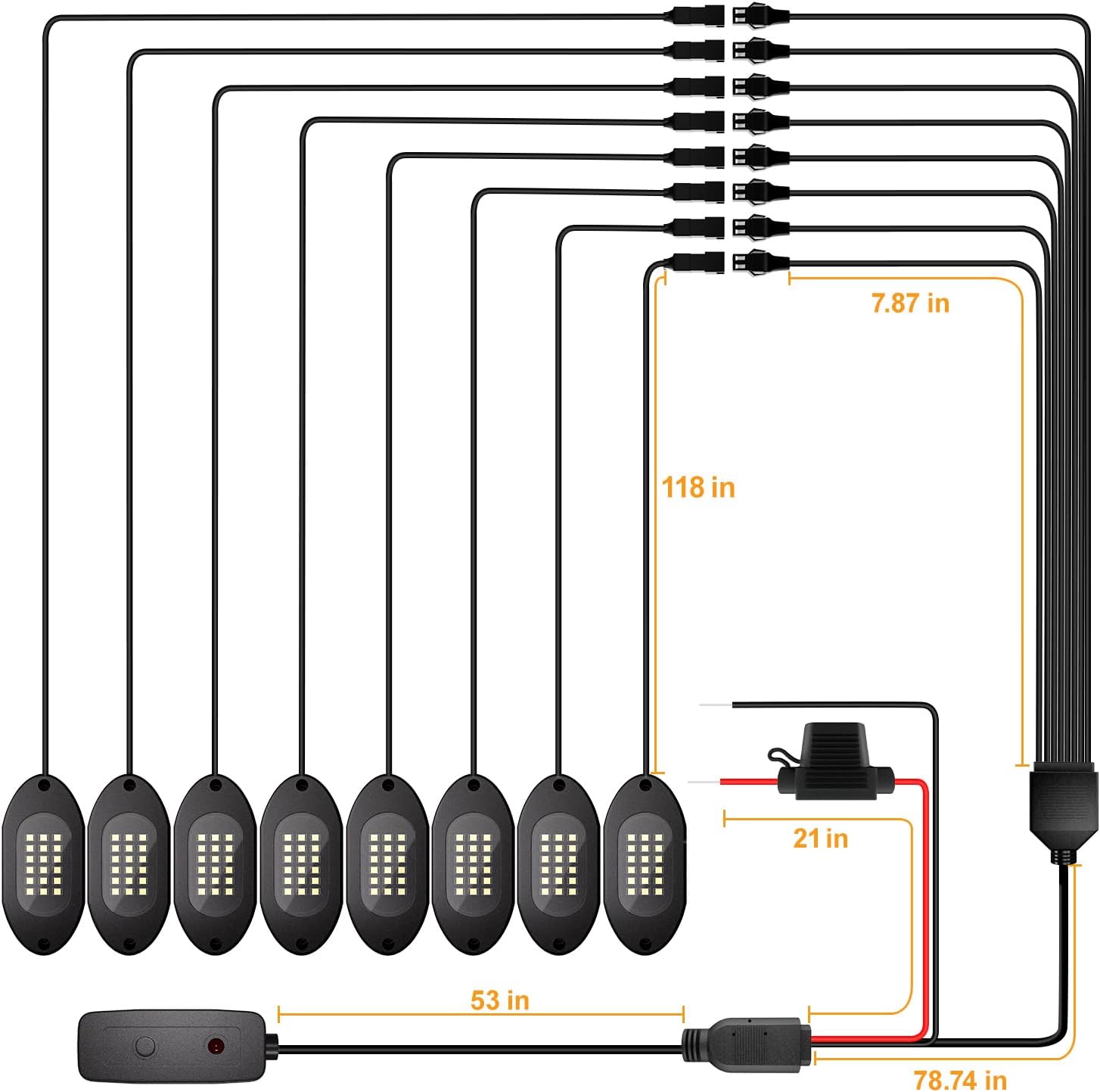 - ăEach Pod Wired is 118 inchesăEach pod comes with a cable length of 118 inches. IIf you want to decorate a large vehicle, you may need to add additional extension cords. Please search for ASIN: B0DLSL74CC on Amazon to add more, this extension wire is plug and play, specifically compatible with Honalia white rock lights for trucks