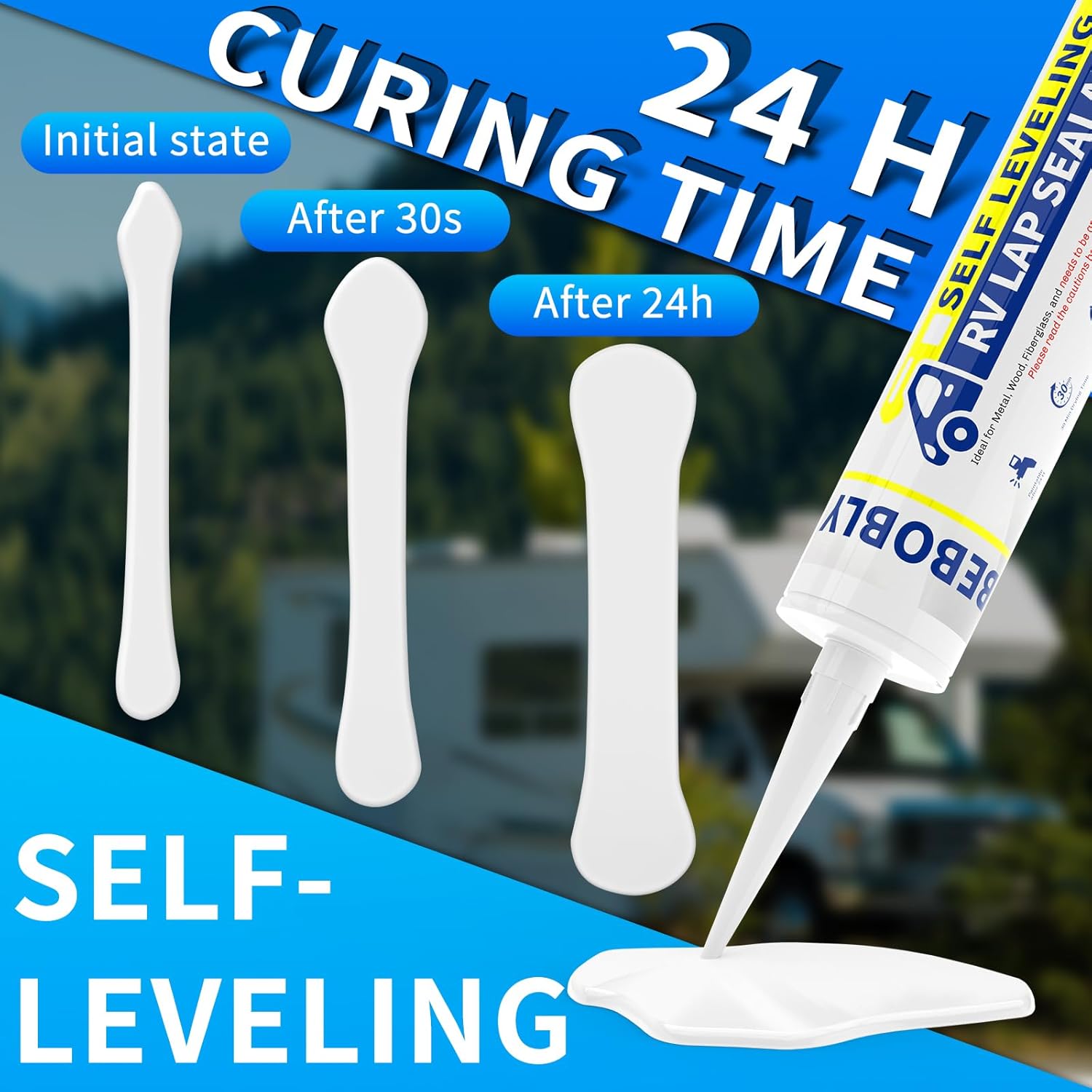 - SELF-LEVELING LAP SEALANT: Our roof sealant is designed for RV roofs. Its self-leveling property makes it easy to use on horizontal applications. It will self-level within 30 seconds, forming a flat surface from a linear shape to better cover and seal the gap, so whether you're an experienced RV owner or a novice, you can easily apply this sealant to your roof.