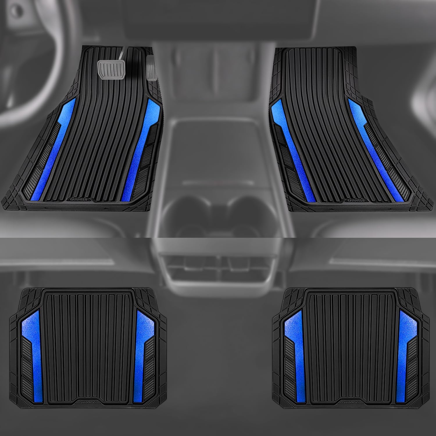 CAR PASS Heavy Duty Rubber Car Mats Metallic,Aluminum Film All Weather Floor Mats Waterproof Universal Trim to Fit Automotive SUV Sedan Van 4 Piece Anodized Deep Dish Two-Tone Sporty Black Blue Chrome