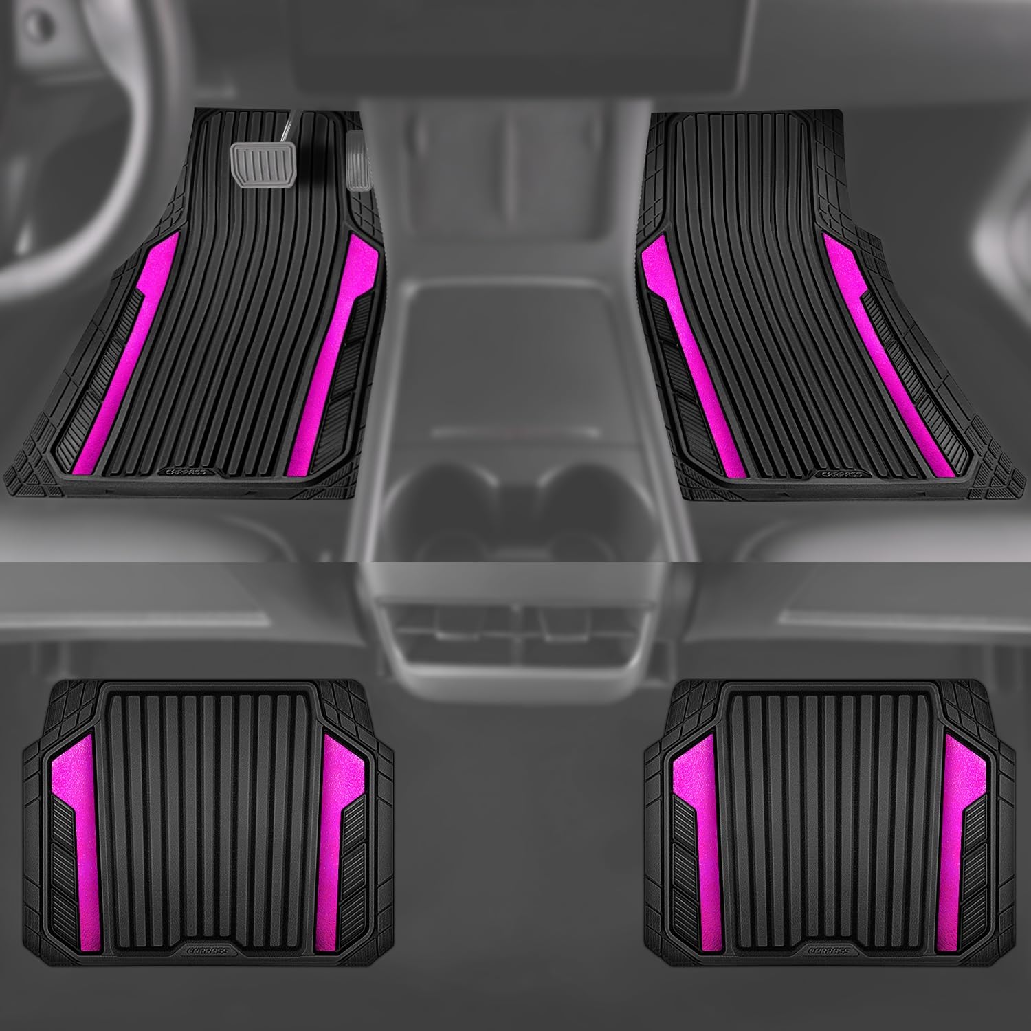 CAR PASS Heavy Duty Rubber Car Mats Metallic, Aluminum Film All Weather Floor Mats Waterproof Universal Trim to Fit for SUV Sedan Van 4 Piece Anodized Deep Dish Two-Tone Sporty Black Hot Pink Chrome