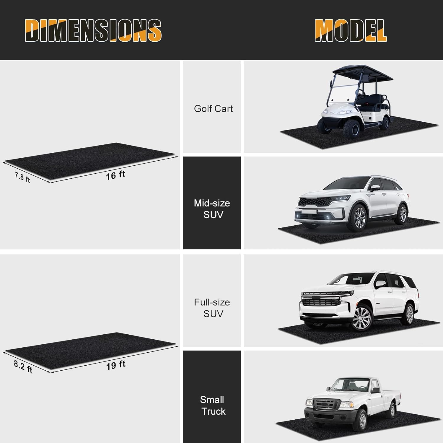 - Universal Fit: 7.8x16 FT, Golf Cart, Mid-Size SUV. Compatible with club car, yamaha, ezgo, icon, Toyota rav4, honda crv, Nissan rogue, Tucson, Mazda cx-5, ford explorer, jeep grand cherokee/Wrangler, Subaru outback.The Garage Floor Mat offers tailored protection for your vehicle, ensuring it remains in pristine condition against spills, dirt, and harsh garage conditions.