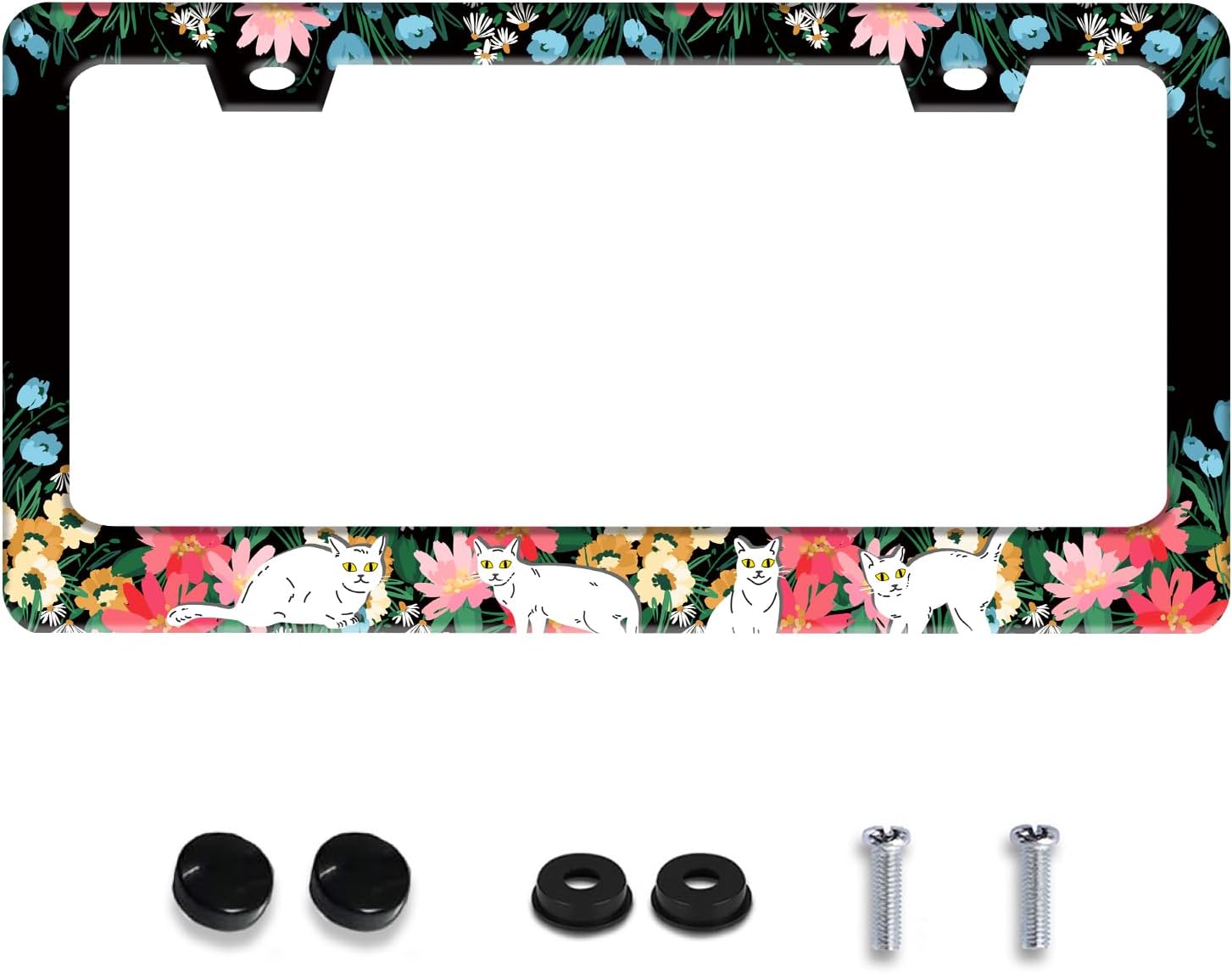 Personalized License Plate Frame Cat Flowers Stainless Steel Accessory Pet License Plate Holder Funny Car Decorative 2 Holes Screws Fits Us Standard License Plates 12.2 X 6.3 in for Men Women