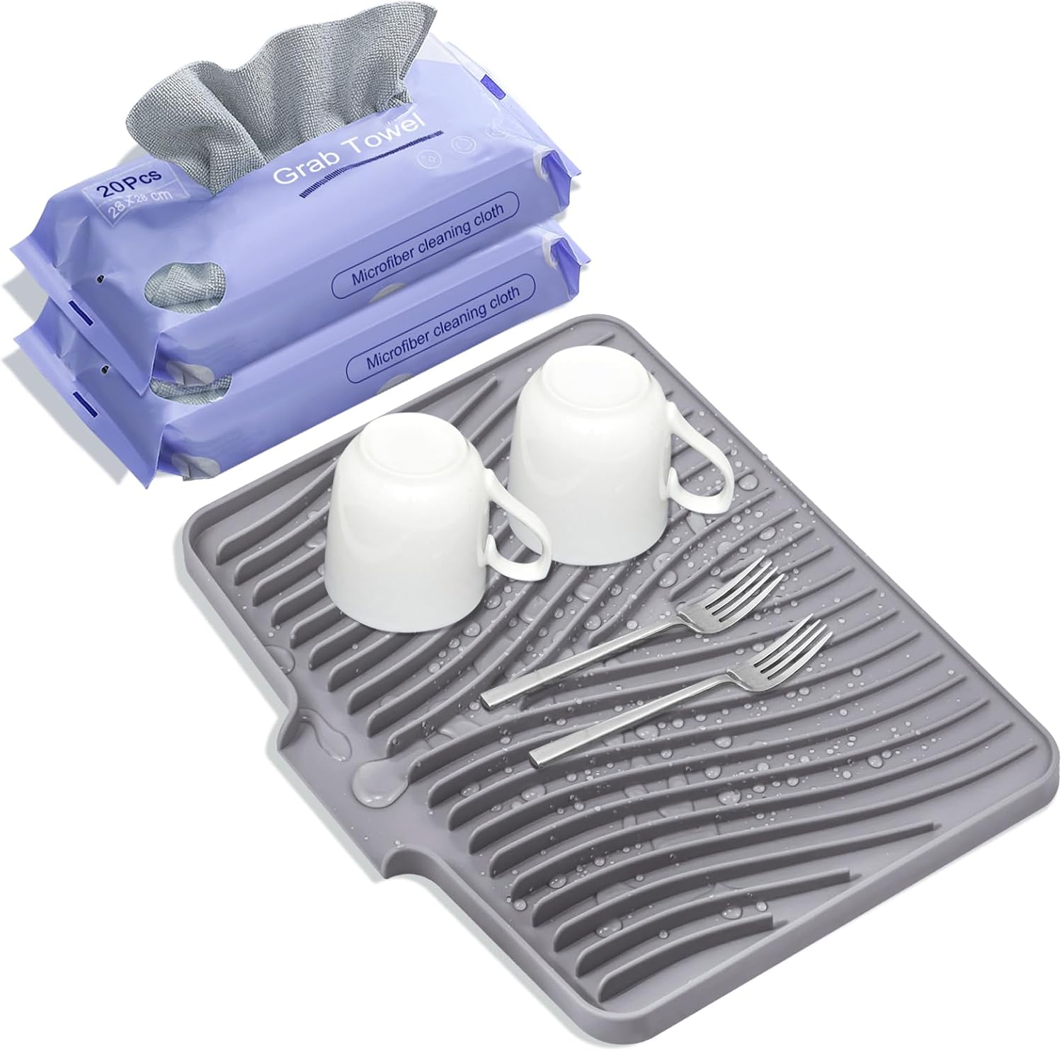 Silicone Dish Drying Mat, Stone Drying Mat for Kitchen Counter with Built-in Drain, Non-Slip 15.8" X 13" Drying Matt Kitchen Counter and Grey Microfiber Cleaning Cloth, Cleaning Rags Set(Grey)