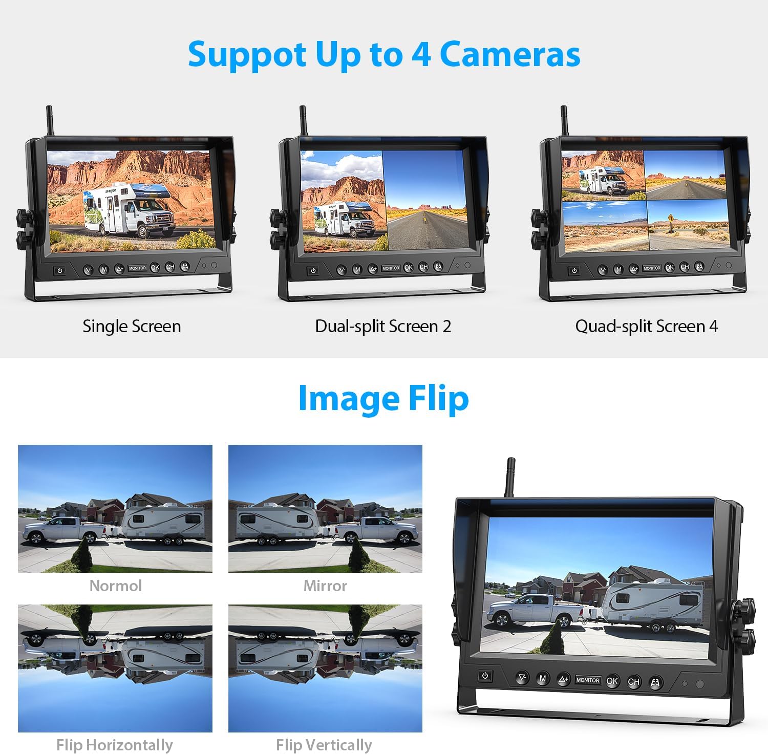 - 9" HD1080P Monitor & DVR Loop Recording: The large 9-inch screen can display images in HD 1080P resolution with a clearer detail view. The rv backup camera system supports up to 4 cameras, which could be setup for dual/quad screen for multiple cameras monitoring at the same time. The system comes with 3 rear/front view cameras, if you need to add more cameras, please contact us to purchase separately. With the DVR loop recording, the system will automatically overwrites the old footages.