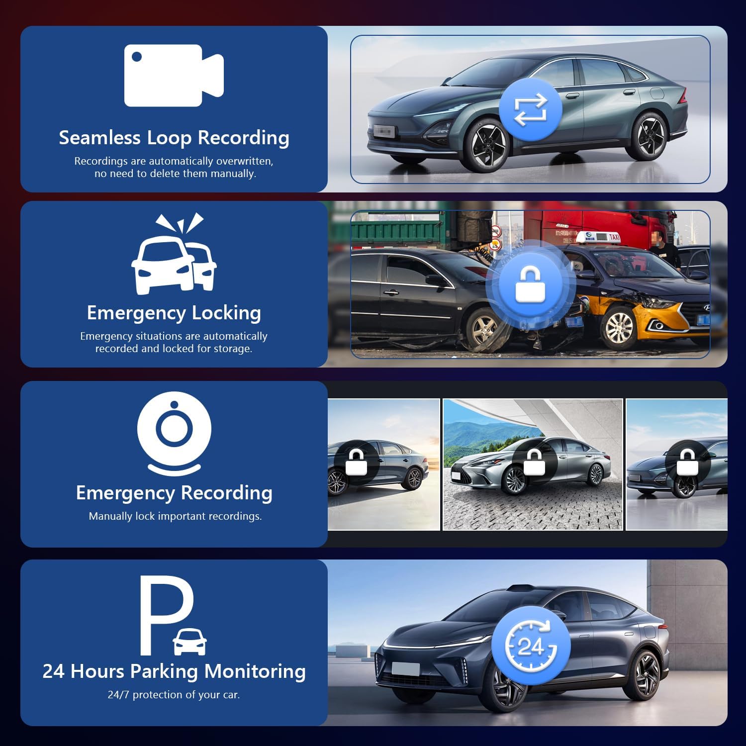- ă4K Front + Rear 1080P Dual Camera Dash CamăThe car screen equipped with front 4K front camera + 1080P waterproof backup camera, with dual-screen recording capabilities and 170° wide-angle lens, support to night vision and loop recording, giving you a clear and accurate record of your journeys.