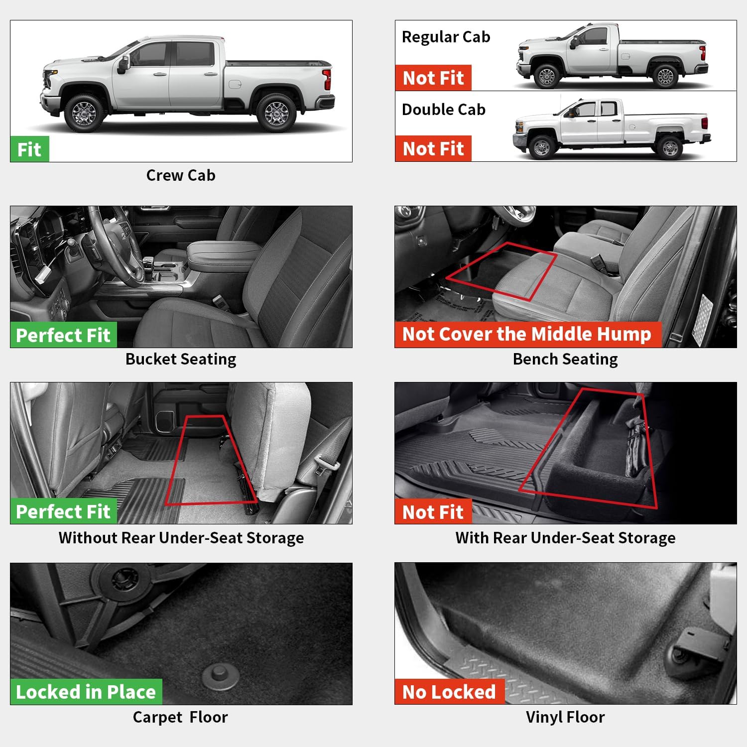 - ăCustom FităLASFIT Floor Mats perfectly fit for Chevrolet Chevy Silverado/GMC Sierra 1500 2019 - 2025, Only Crew Cab/4 Full Door (Not Fit Regular Cab/Double Cab), 2500HD 3500HD 2020 - 2025 Crew Cab Only, Carpet Floor, Fit Without Rear Under-Seat Storage Box.(Not Fit 2nd Row Plastic Storage)