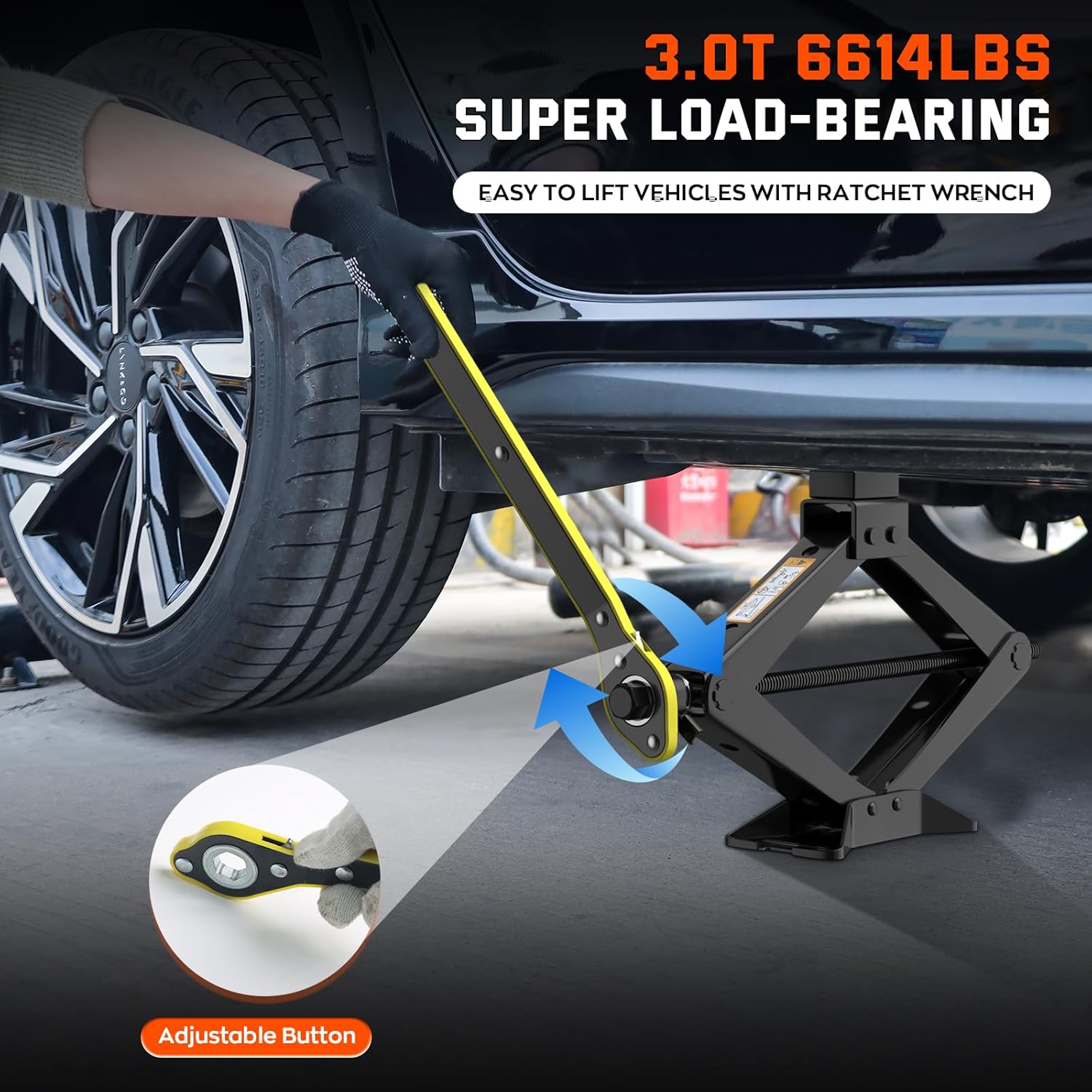 - 【Portable Tire Jack Kit】1x 3T Scissor jack; 1x Ratchet Wrench; it fits perfectly in your trunk or garage, ready to tackle any emergency tire replacement job.
