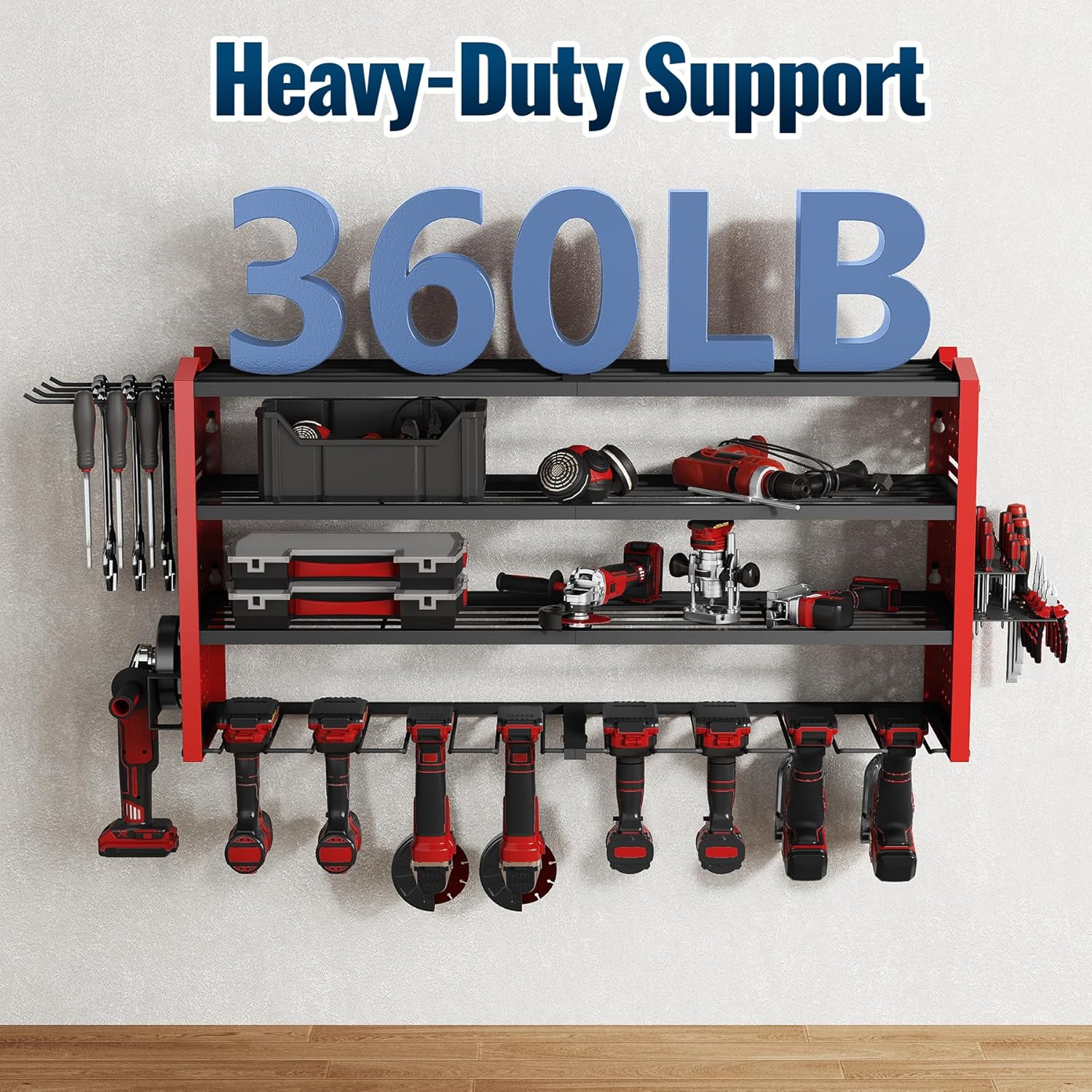 Tomorotec Wall-Mounted Power Tool Storage Rack for Drill, Toolbox & Accessories, Heavy-Duty Steel Organizer with Side Hooks and Adjustable Shelves, Easy Installation Garage & Workshop Storage (Red)