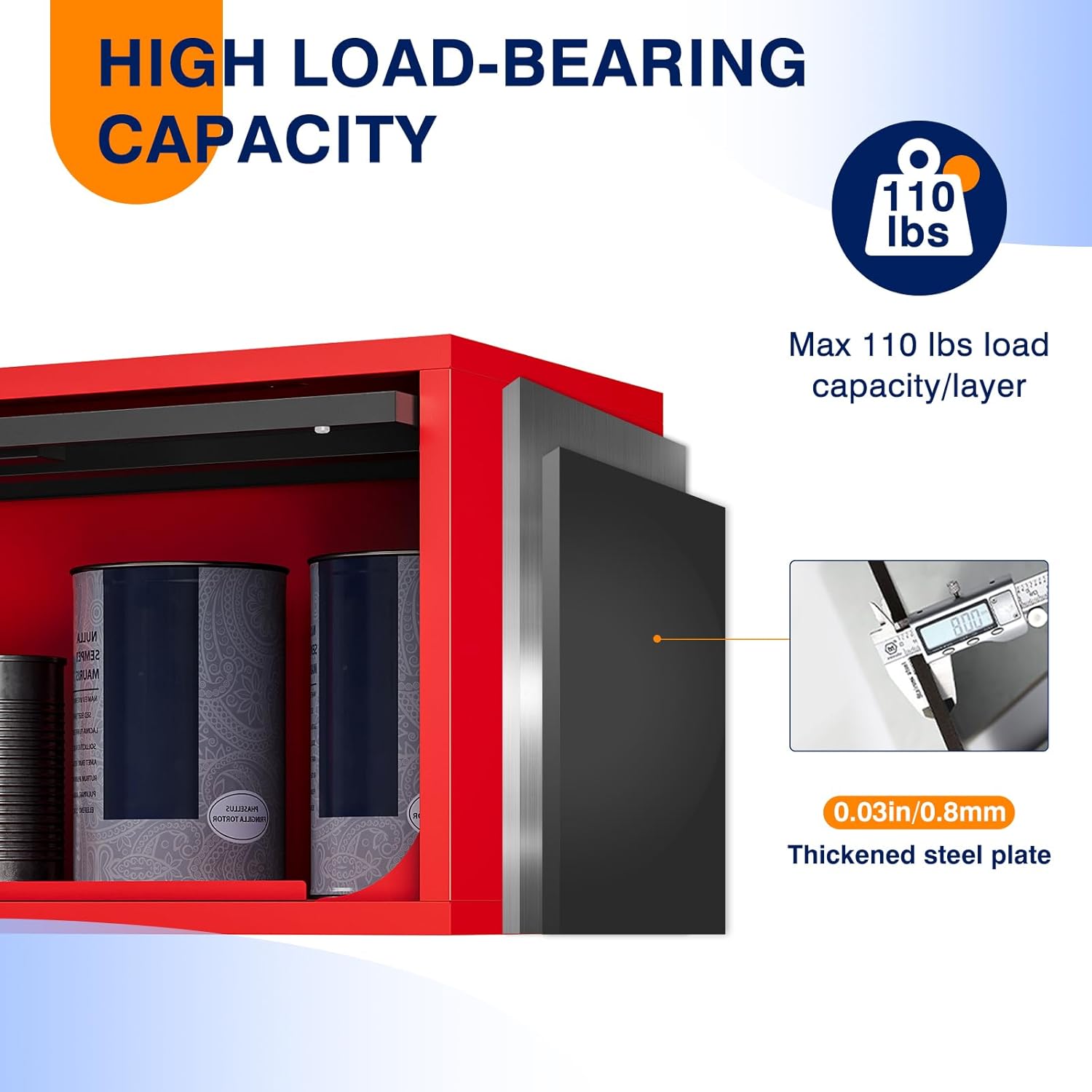 - ăPREMIUM QUALITY MATERIALă Heavy Duty Garage Storage Cabinets are made from 0.8mm high pressure steel plate that can withstand loads of up to 120lbs; the powder coating gives the cabinets a textured look and is rust and scratch resistant to complement a variety of decor styles.