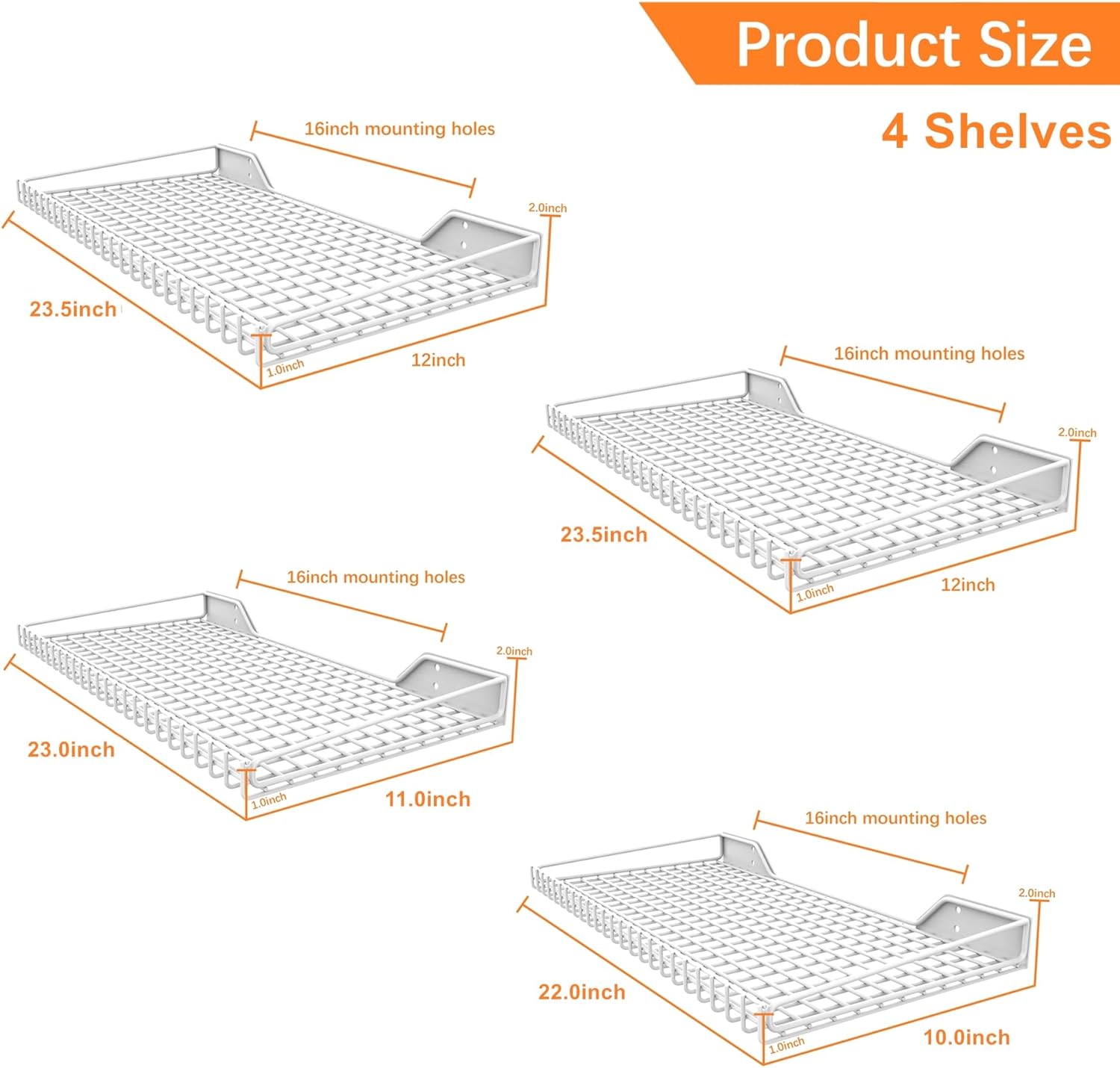 - Package Includes: 4 durable wall shelves in 3 versatile sizes, providing flexible storage solutions for laundry room, garage, closet. If you're not satisfied, we're dedicated to addressing your needs and ensuring your satisfaction