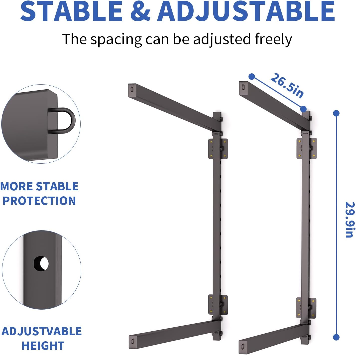 - Space-saving: The support rod is 29.9in long, which can carry wide kayaks. The upward tilt angle makes the kayak less likely to slide. Compared with the floor-standing rack, it saves more space.Sturdy and Stable: Made of thickened iron; it is not easy to bend or break after long-term use. The surface is sprayed with a waterproof coating, which can withstand the test of sun and rain, and can be placed outdoors or indoors.