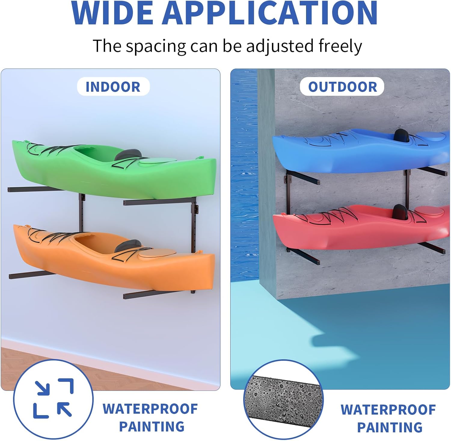 - Load-bearing Capacity: Made of high-quality iron structure, the total load of the wall-mounted kayak storage rack can reach 180 pounds, which can stably carry 2 kayaks. You can store kayaks with confidence. You can also use it to carry small canoes, paddle boards and other water sports equipment.