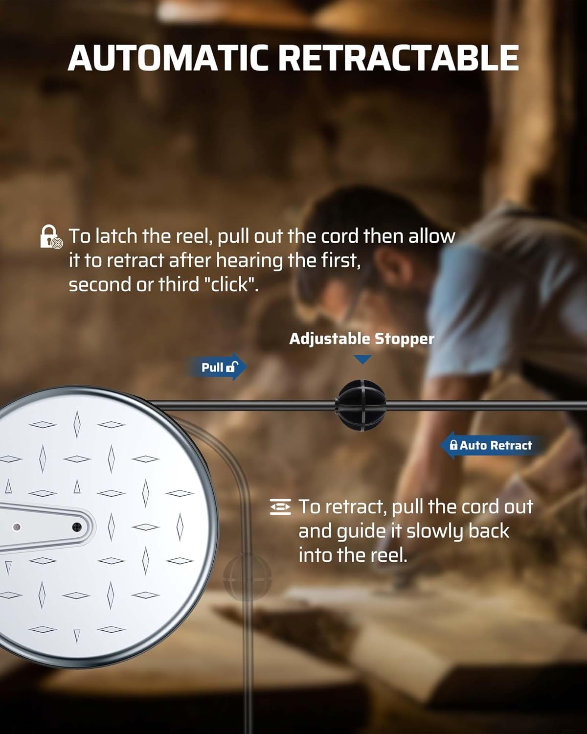- 【 Automatic Retractable 】 The power cord reel retracts quickly and smoothly with a clever auto-guide rewind mechanism to avoid kinks and tangles; the ratcheting system will lock the cord at any length and allow you to quickly store it when finished