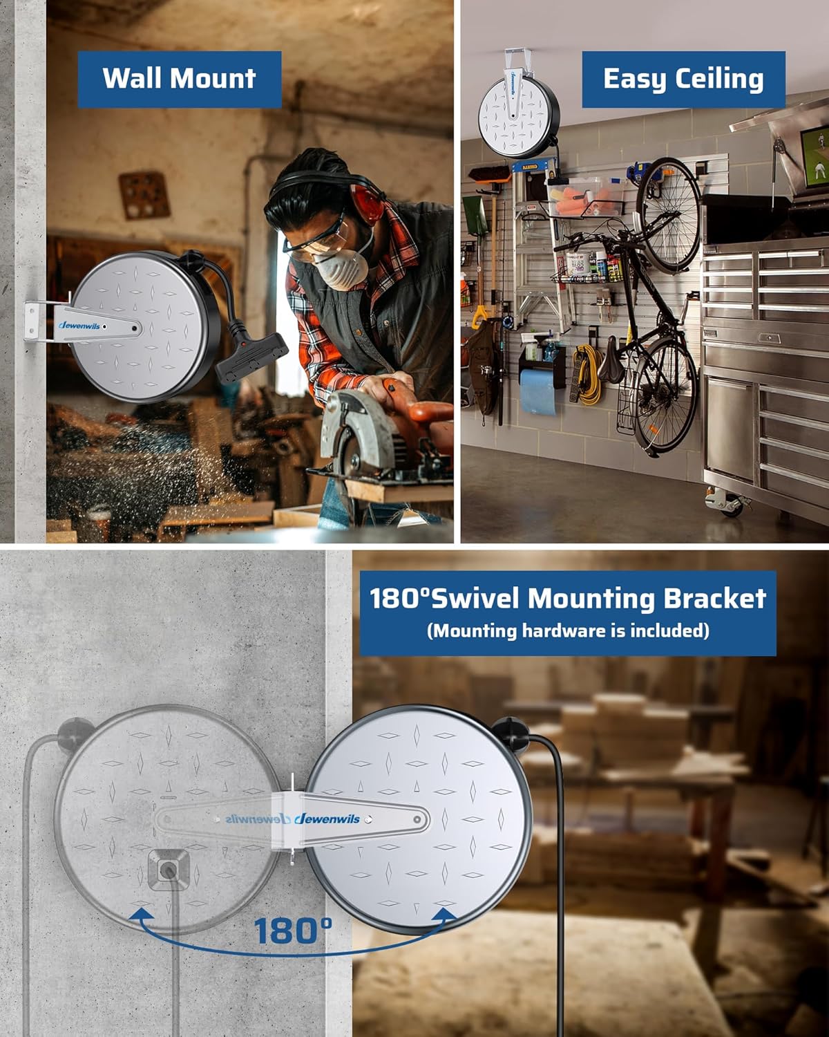 - 【 Easily Ceiling / Wall Mount with 180 Degree Swivel】 The swivel mounting bracket lets the extension cord reel swivel freely up to 180 degrees; perfect for hanging from your garage ceiling or mounting to a wall;easily pull and release cord from multiple directions; free up more work space and makes storage a breeze; avoid tangled cords or people tripping up
