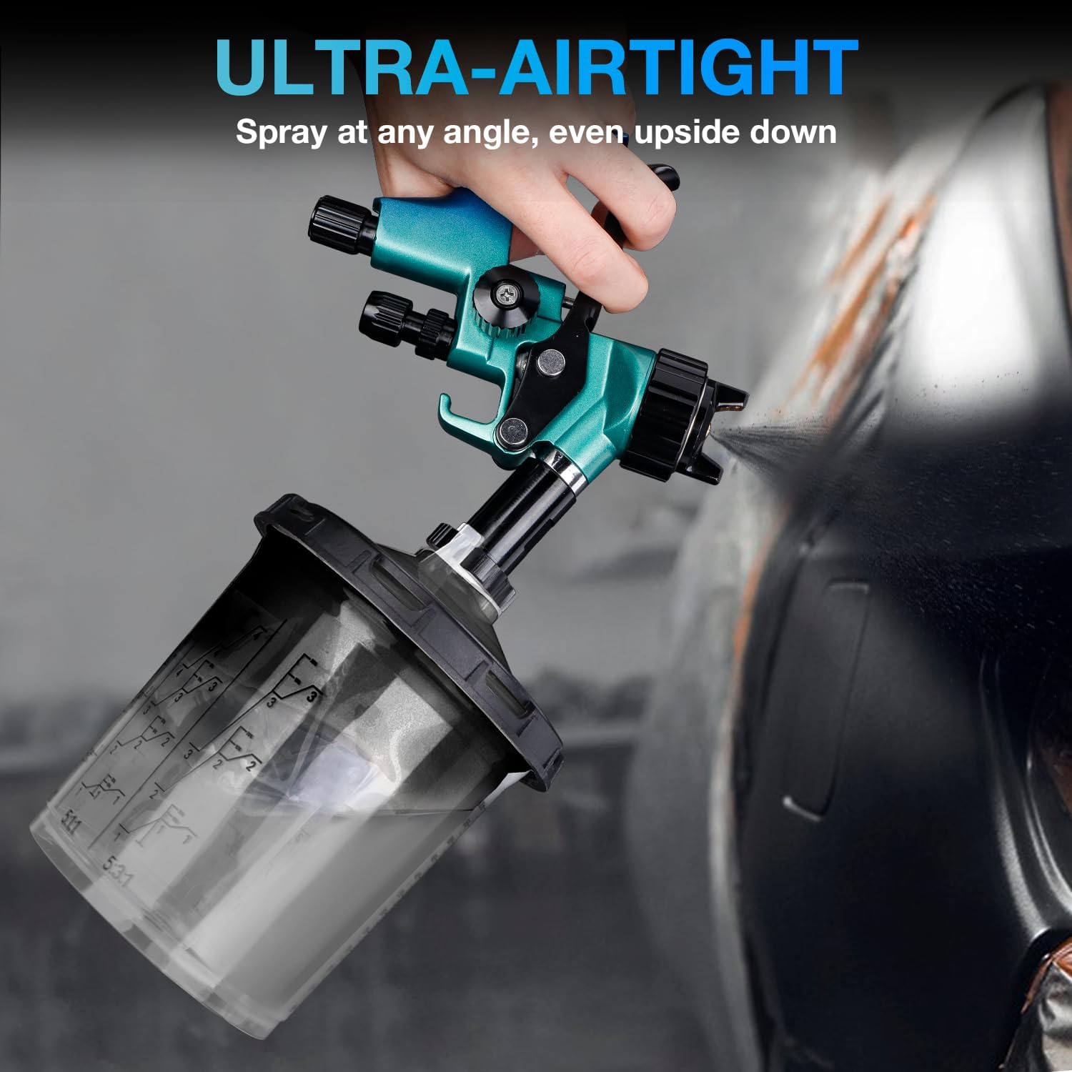 - 360Β° Spray At Any Angle: The tightly sealed paint gun cup system allows you to spray at any angle, even upside down, ensuring every drop is used without waste. Precisely molded, the paint cup liner and lid fit perfectly together.