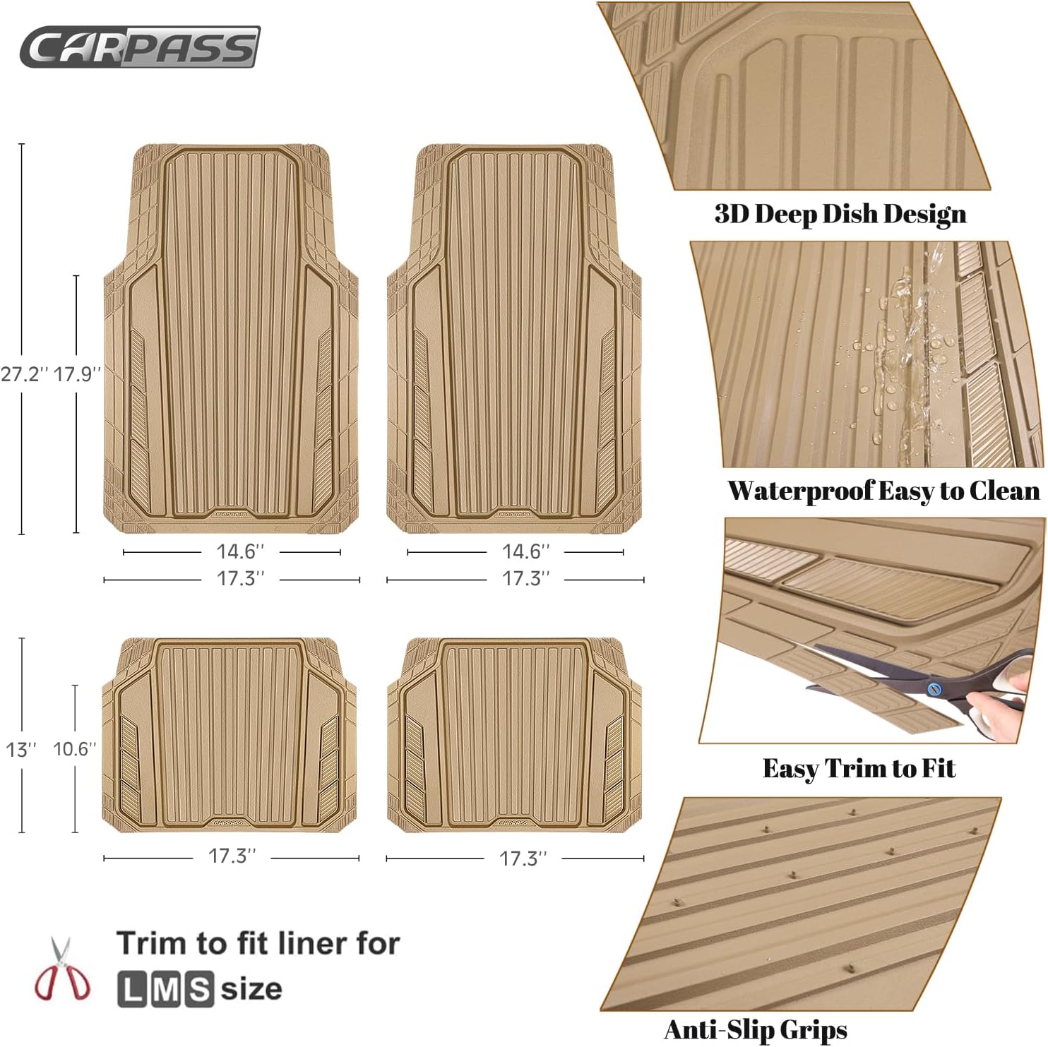 CAR PASS Heavy Duty Sporty Rubber Car Mats, Deep Dish All Weather Car Floor Mats Full Set, Waterproof Anti-Slip Automotive Matts Rugs Trim to Fit for Most Sedans SUVs, 4-Piece All Beige