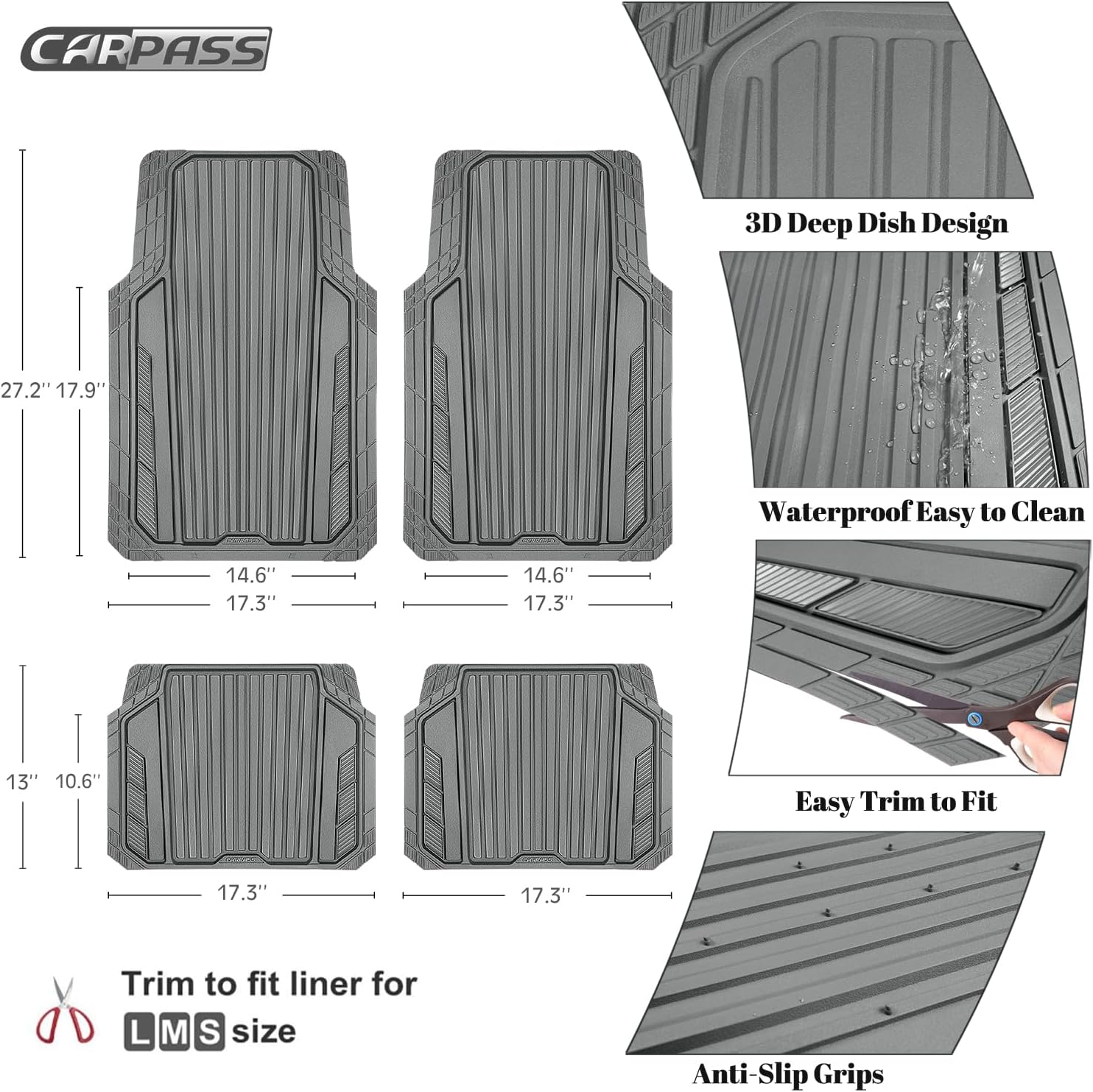 CAR PASS Heavy Duty Sporty Rubber Car Mats, Deep Dish All Weather Car Floor Mats Full Set, Waterproof Anti-Slip Automotive Matts Rugs Trim to Fit for Most Sedans SUVs Vans, 4-Piece All Gray