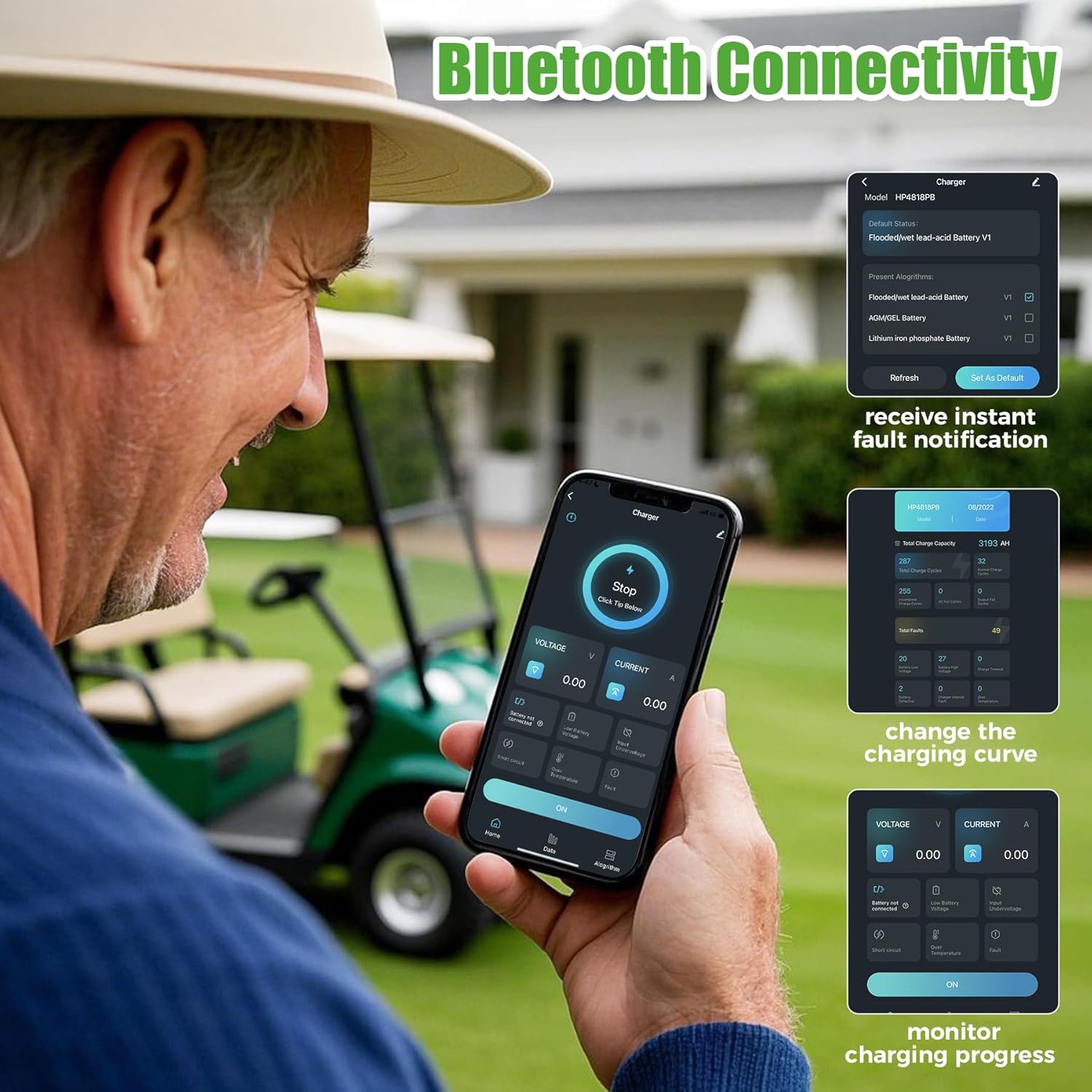 - Multi-functional Battery Compatibility: Our golf cart charger compatibility with three battery types: lead-acid, maintenance-free, and lithium iron phosphate, ensuring seamless compatibility with the battery type in your cart. You do not the need to purchase different chargers. 10L0L charger is your first choice.