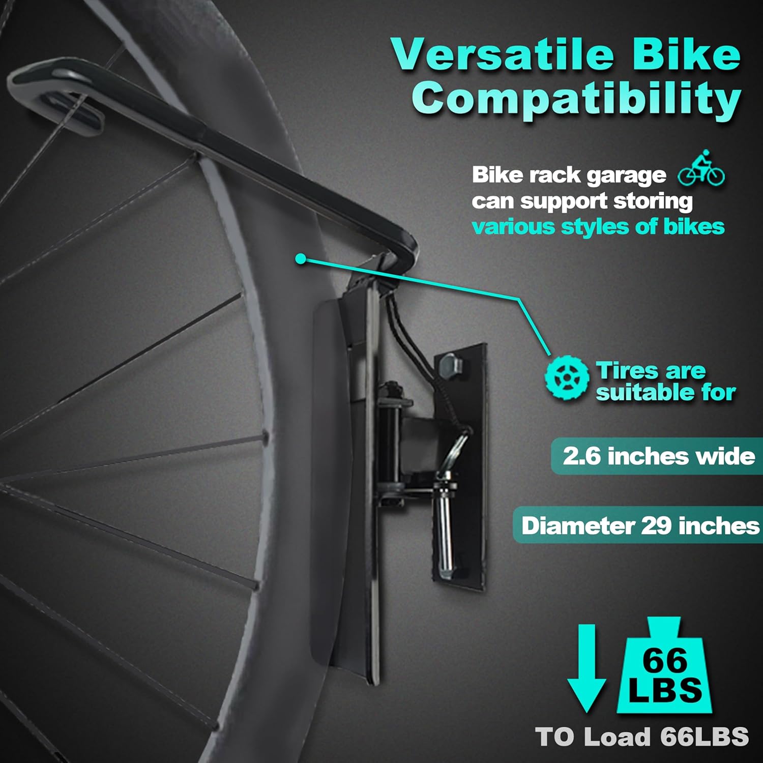 - [Versatile Bike Compatibility] bike rack garage can support storing various styles of bikes, such as road bikes, mountain bikes, e-bikes, kids' bikes, etc. bicycle wall mount fits bicycle tires up to 2.6 inches wide and 29 inches in diameter. bike hangers for garage each can hang weight of up to 30 kg/66.2 lbs.