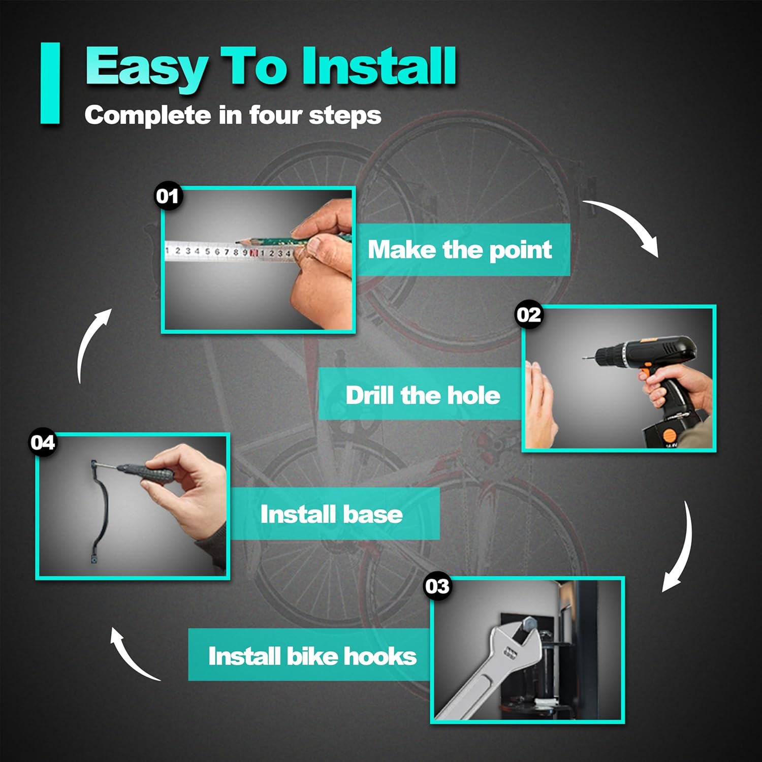 - [Easy To Install] The ideal bike rack for your garage is simple to use, simply hook the front wheel, place the rear wheel on the stabilizer and rotate the swivel bike rack wall mount to the desired angle.