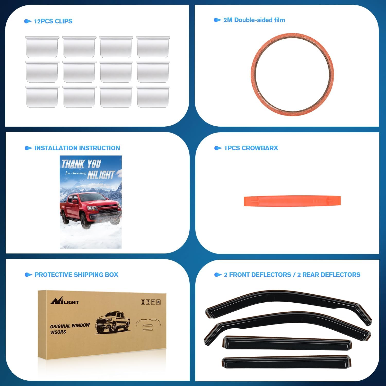 - PACKAGE INCLUDED:4 PCS Rain Guards,12pcs clips,Crowbar 1pcs,78inch double-sided tape and installation instruction