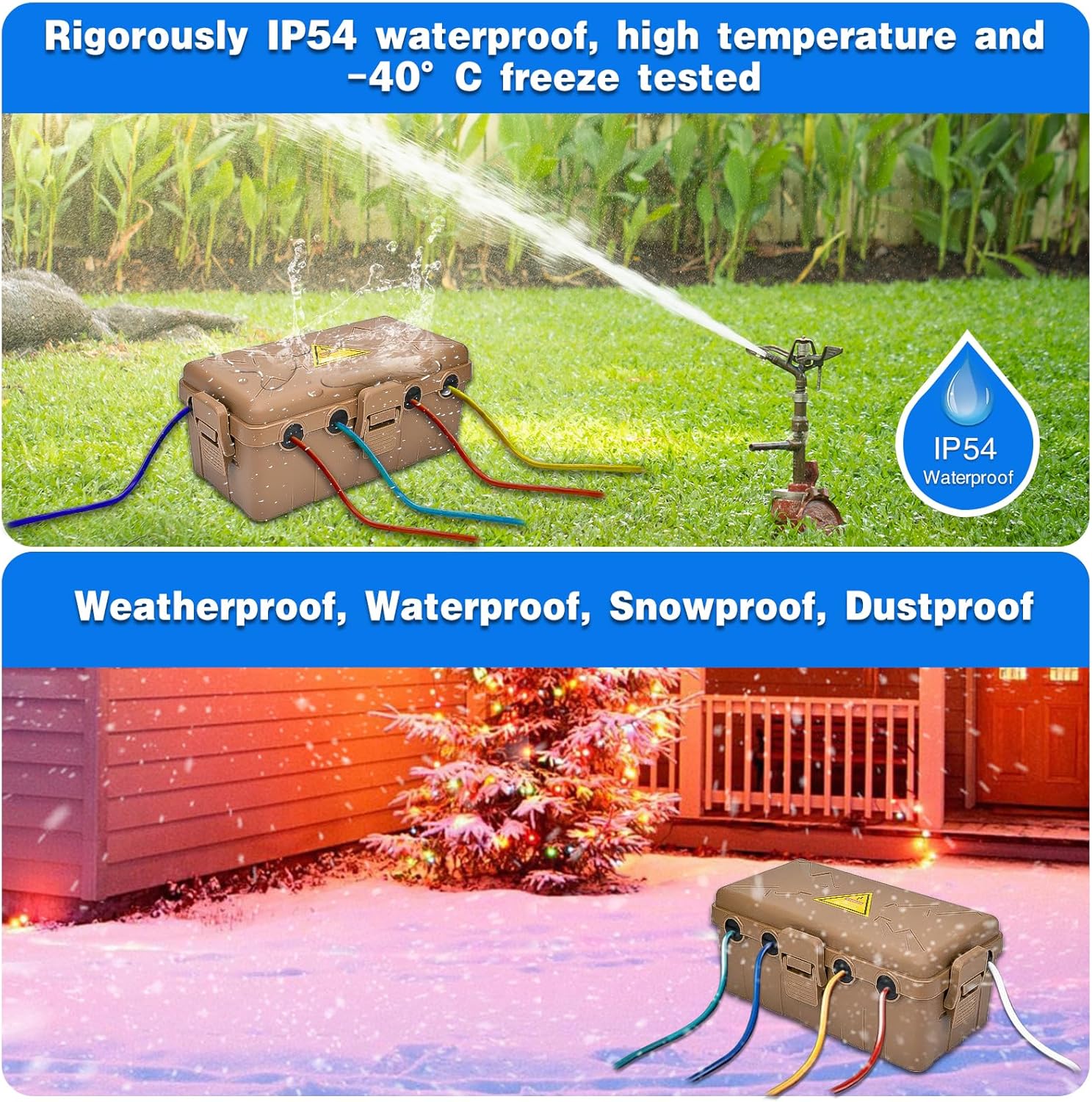 - IP54 WATERPROOF: Made of heavy-duty reinforced PP material, it is rigorously tested to IP54 waterproof, high temperature and -40℃ freezing, can withstand up to 300 lbs. and is resistant to rain, water, snow, dust, dirt.Suitable for protecting outdoor power outlets, row plugs, timers, extension cords, adapters etc.