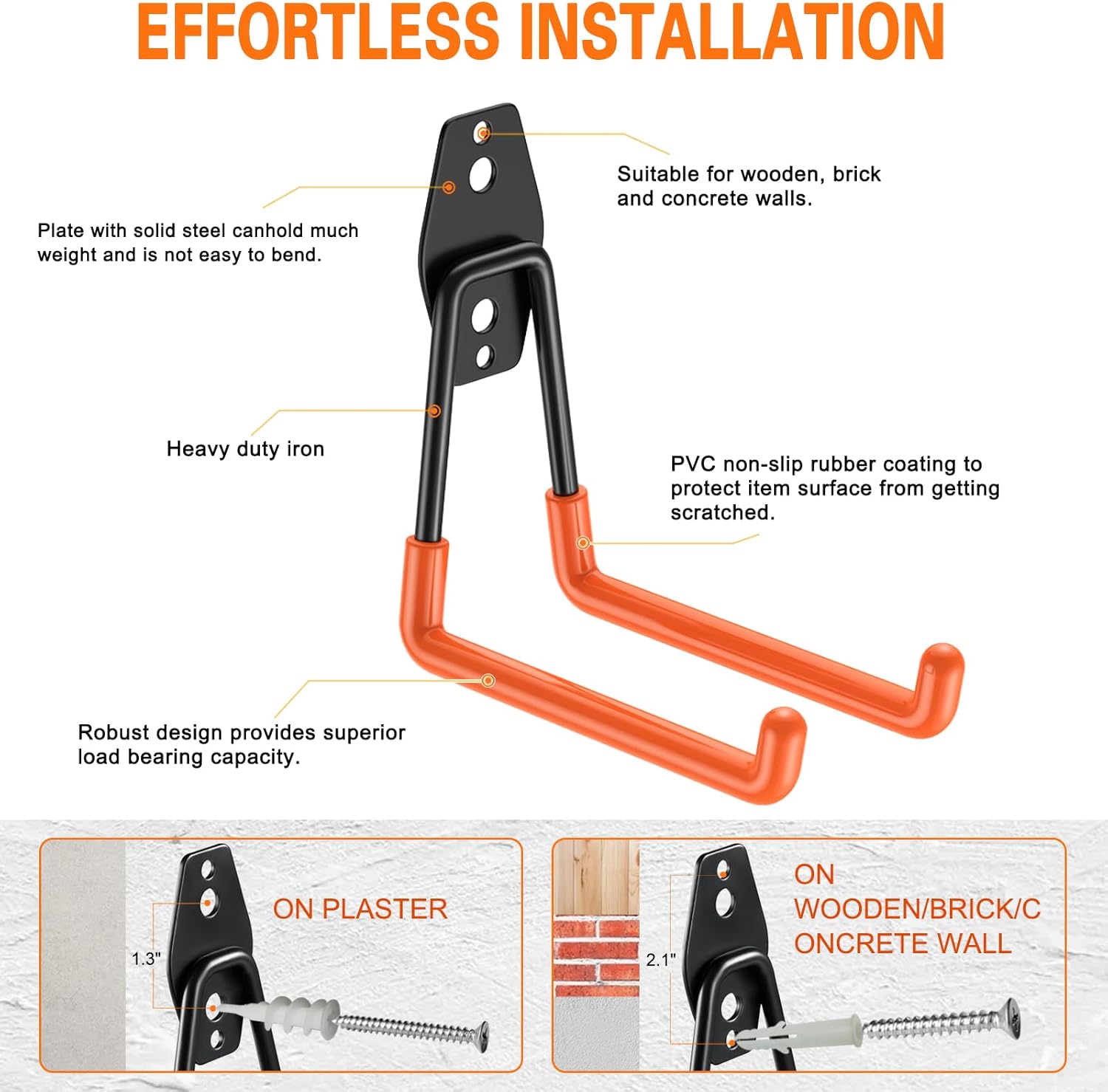 - Easy Installation: The garage hooks come with two types of screws, including 20 sets of screws and wall plugs, to accommodate different wall surfaces. Depending on your storage needs, you can install the garage wall hooks on brick/concrete/wood walls or drywall.